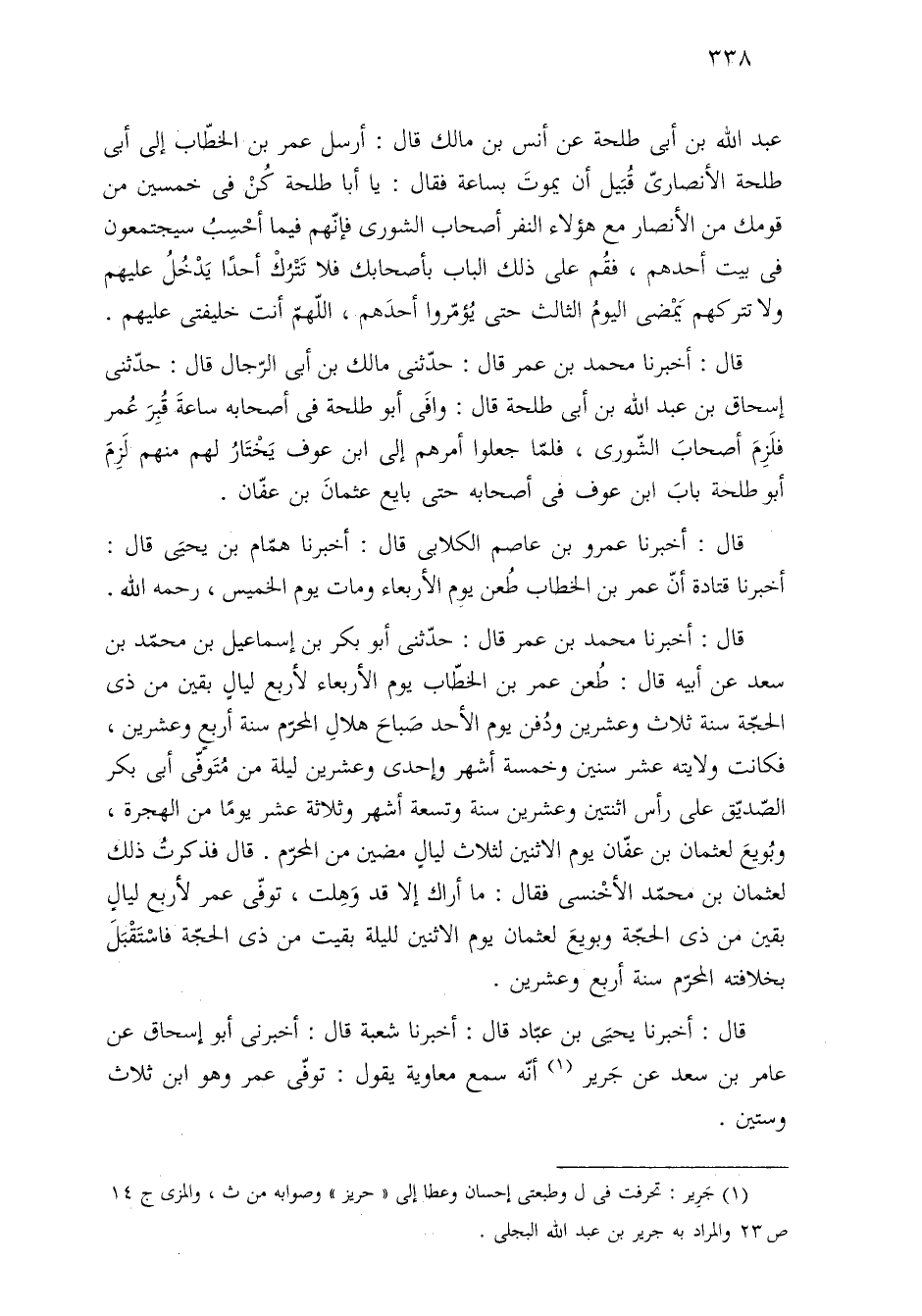 قال: أخبرنا عمرو بن عاصم الكلابى قال: أخبرنا همّام بن يحيَى قال: أخبرنا قتادة أنّ عمر بن ااخطاب طُعن يوِم الأربعاء ومات يوم الخميس، رحمه الله.