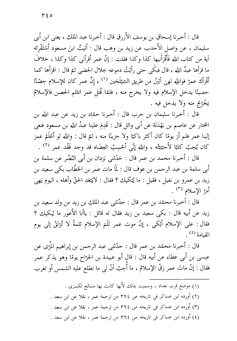 قال: أخبرنا إسحاق بن يوسف الأزرق قال: أخبرنا عبد الملك، يعنى ابن أبى سليمان، عن واصل الأحدب عن زيد بن وهب قَال: أتيتُ ابنَ مسعود أسْتَقْرِئه آية من كتاب الله فَأَقْرَأَنيها كذا وكذا فقلت: إنّ عمر أقرأنى كذا وكذا، خلافَ ما قرأها عبدُ الله، قال فبكَى حتّى رأيْتُ دموعه خِلال الحصَى ثمّ قال: اقرَأها كما أقْرَأك عمرُ فواللِّه لهىَ أبْينُ من طريق السّيْلَحَين (¬١)، إِنَّ عمر كان للإسلام حِصْنًا حصينًا يدخل الإسلام فيه ولا يخرج منه، فلمّا قُتل عمر انثلم الحصن فالإسلامُ يَخْرُجُ منه ولا يدخل فيه.