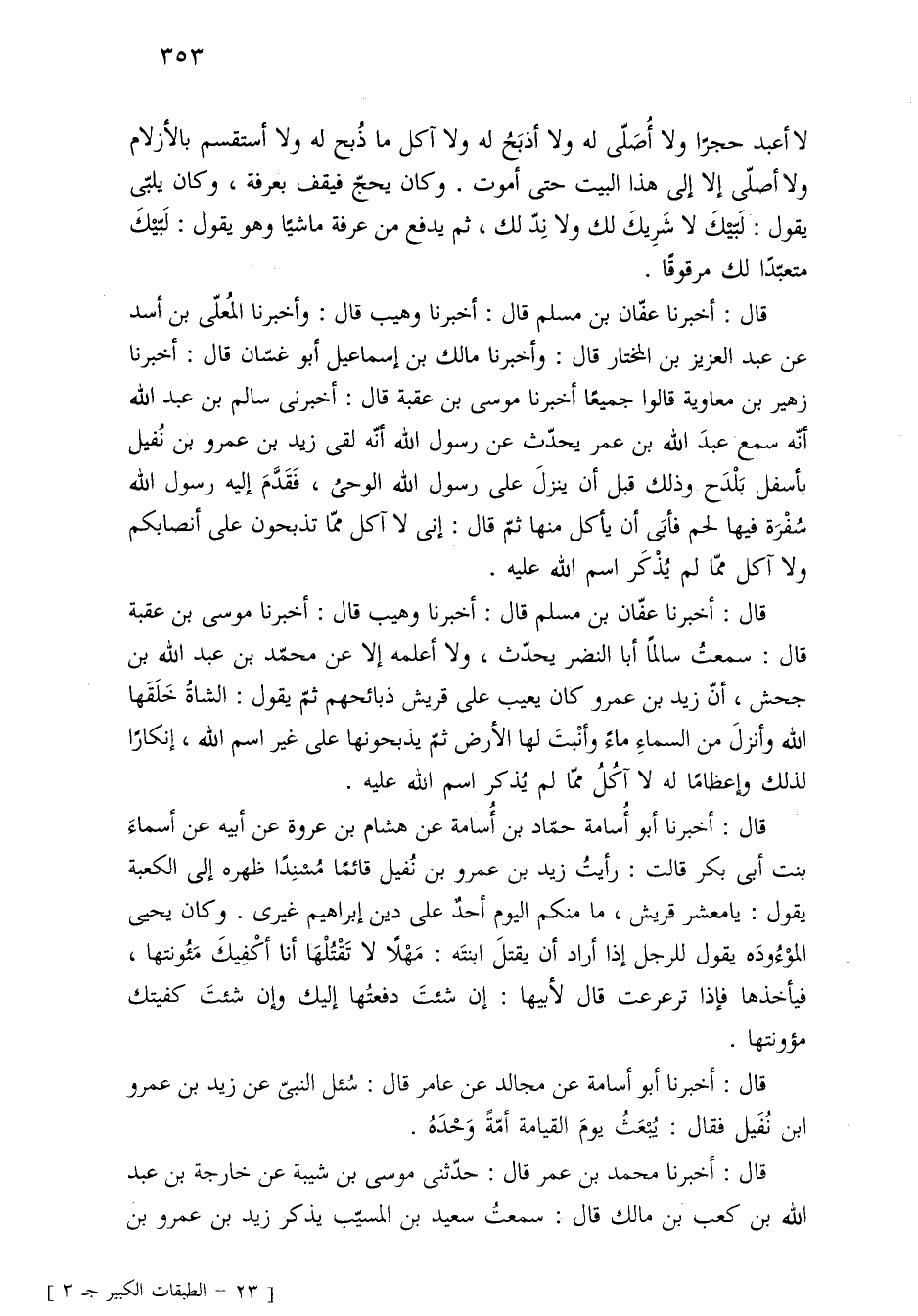 قال: أخبرنا عفّان بن مسلم قال: أخبرنا وهيب قال: أخبرنا موسى بن عقبة قال: سمعت سالمًا أبا النضر يحدّث، ولا أعلمه إِلَّا عن محمّد بن عبد الله بن جحش، أنّ زيد بن عمرو كان يعيب على قريش ذبائحهم ثمّ يقول: الشاةُ خَلَقَها الله وأنزلَ من السماءِ ماءً وأنْبتَ لها الأرض ثمّ يذبحونها على غير اسم الله، إنكارًا لذلك وإعظامًا له لا آكُلُ ممّا لم يُذكر اسم الله عليه.
