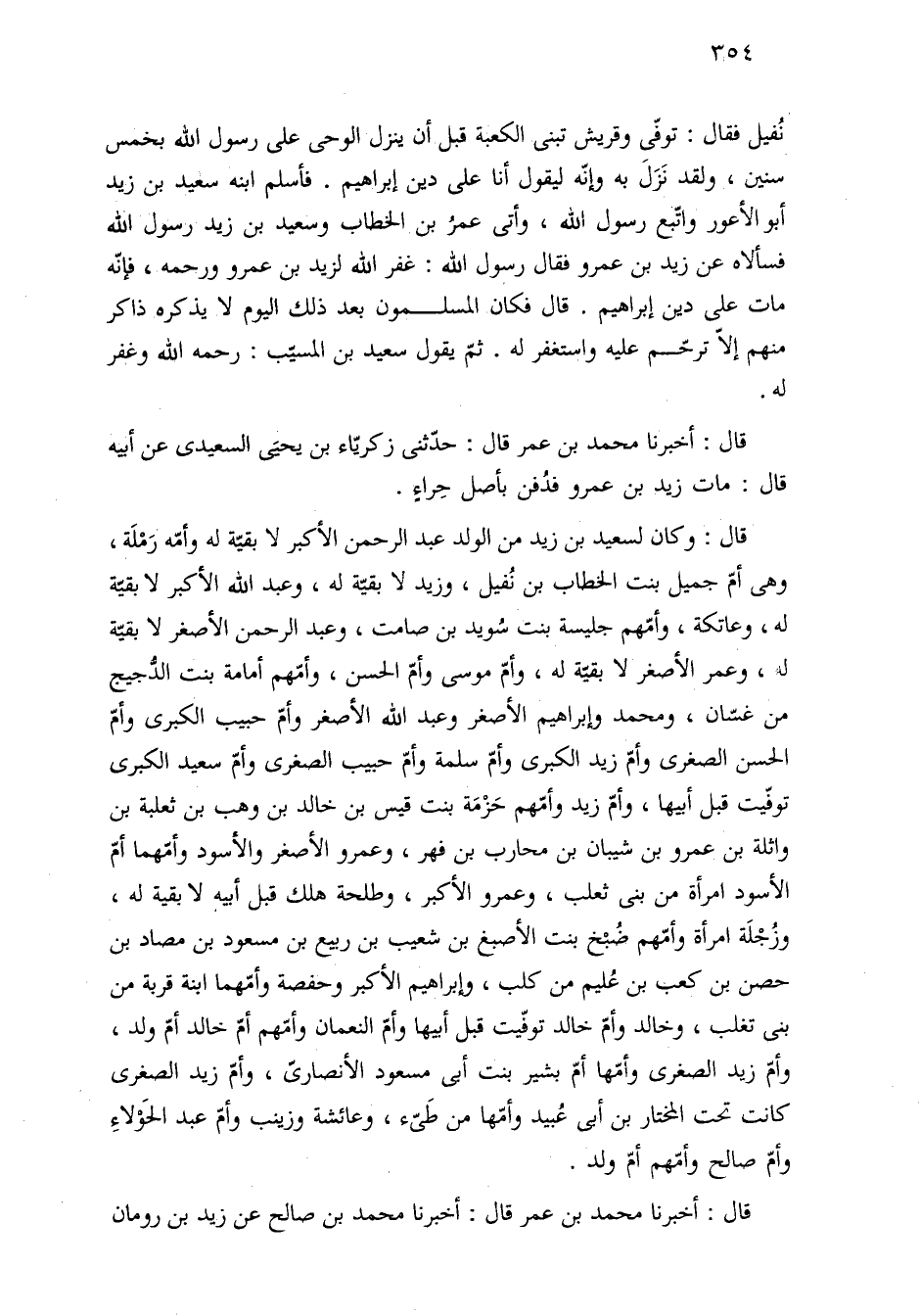 نُفيل فقال: توفّى وقريش تبنى الكعبة قبل أن ينزل الوحى على رسول الله بخمس سنين، ولقد نَزَلَ به وإنه ليقول أنا على دين إبراهيم. فأسلم ابنه سعيد بن زيد أبو الأعور واتّبع رسول الله، وأتى عمرُ بن الخطّاب وسعيد بن زيد رسول الله فسألاه عن زيد بن عمرو فقال رسول الله: غفر الله لزيد بن عمرو ورحمه، فإنّه مات على دين إبراهيم. قال فكان المسلمون بعد ذلك اليوم لا يذكره ذاكر منهم إِلَّا ترحّم عليه واستغفر له. ثمّ يقول سعيد بن المُسَيَّب: رحمه الله وغفر له.