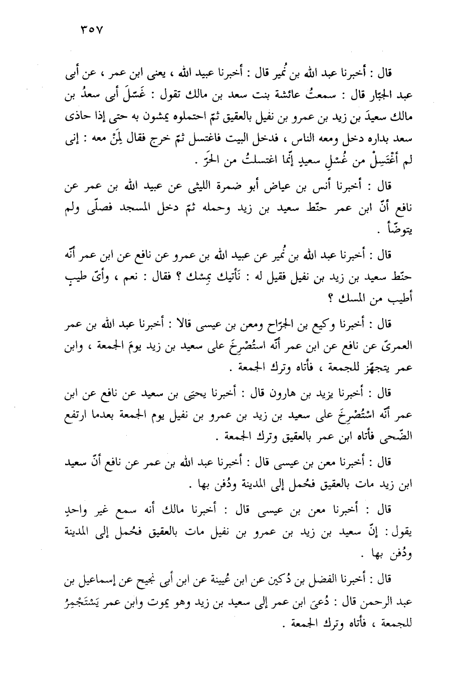 قال: أخبرنا عبد الله بن نُمير قال: أخبرنا عبيد الله، يعنى ابن عمر، عن أبي عبد الجبّار قال: سمعتُ عائشة بنت سعد بن مالك تقول: غَسّلَ أبي سعدُ بن مالك سعيدَ بن زيد بن عمرو بن نفيل بالعقيق ثمّ احتملوه يمشون به حتّى إذا حاذى سعد بداره دخل ومعه النَّاس، فدخل البيت فاغتسل ثمّ خرج فقال لِمَنْ معه: إنى لم أغْتَسِلْ من غُسْلِ سعيدٍ إنّما اغتسلتُ من الحَرّ.