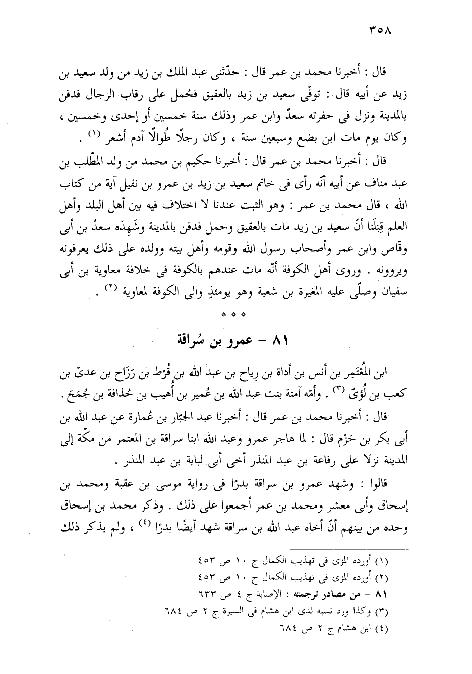 قال: أخبرنا محمّد بن عمر قال: أخبرنا عبد الجبّار بن عُمارة عن عبد الله بن أبى بكر بن حَزْم قال: لمّا هاجر عمرو وعبد الله ابنا سراقة بن المعتمر من مكّة إلى المدينة نزلا على رفاعة بن عبد المنذر أخى أبى لبابة بن عبد المنذر.
