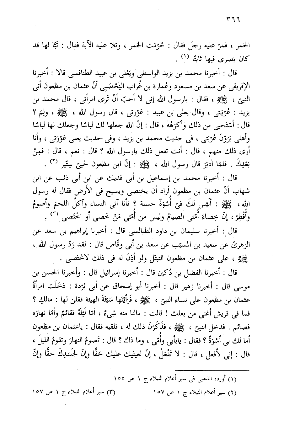 قال: أخبرنا سليمان بن داود الطيالسى قال: أخبرتا إبراهيم بن سعد عن الزهريّ عن سعيد بن المسيّب عن سعد بن أبي وقّاص قال: لقد رَدّ رسول الله، -صلى الله عليه وسلم-، على عثمان بن مظعون التبتّل ولو أذِنَ له في ذلك لاخْتَصى.