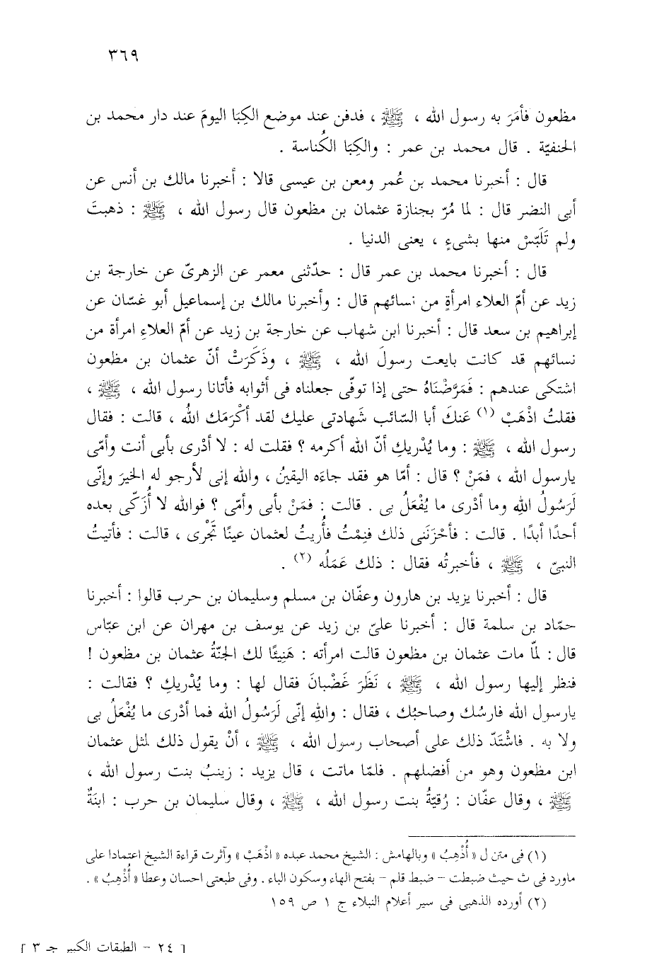 قال: أخبرنا يزيد بن هارون وعفّان بن مسلم وسليمان بن حرب قالوا: أخبرنا حمّاد بن سلمة قال: أخبرنا عليّ بن زيد عن يوسف بن مهران عن ابن عبّاس قال: لمَّا مات عثمان بن مضعون قالت امرأته: هَنِيئًا لك الجنّةُ عثمان بن مظعون! فنظر إليها رسول الله، -صلى الله عليه وسلم-، نَظَرَ غَضْبانَ فقال لها: وما يُدْريكِ؟ فقالت: يا رسول الله فارسُك وصاحبُك، فقال: والله إنّى لَرَسُولُ الله فما أدْرى ما يُفْعَلُ بى ولا به. فاشْتَدّ ذلك على أصحاب رسول الله، -صلى الله عليه وسلم-، أنْ يقول ذلك لمثل عثمان ابن مظعون وهو من أفضلهم. فلمّا ماتت، قال يزيد: زينبُ بنت رسول الله، -صلى الله عليه وسلم-، وقال عفّان: رُقيّةُ بنت رسول الله، -صلى الله عليه وسلم-، وقال سليمان بن حرب: ابنَةٌ
