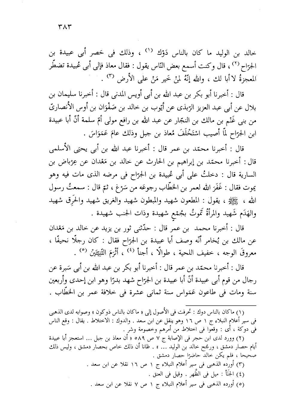(¬٢) وورد لدى ابن حجر فى الإصابة ج ٧ ص ٥٨٩ "أن معاذ بن جبل ... استعجز أبا عبيدة أيام حصار دمشق، ورجّح خالد بن الوليد ... ". ظانا أن ذلك خاص بحصار دمشق، وليس ذلك صحيحا، فلم يكن خالد حاضرًا حصار دمشق.