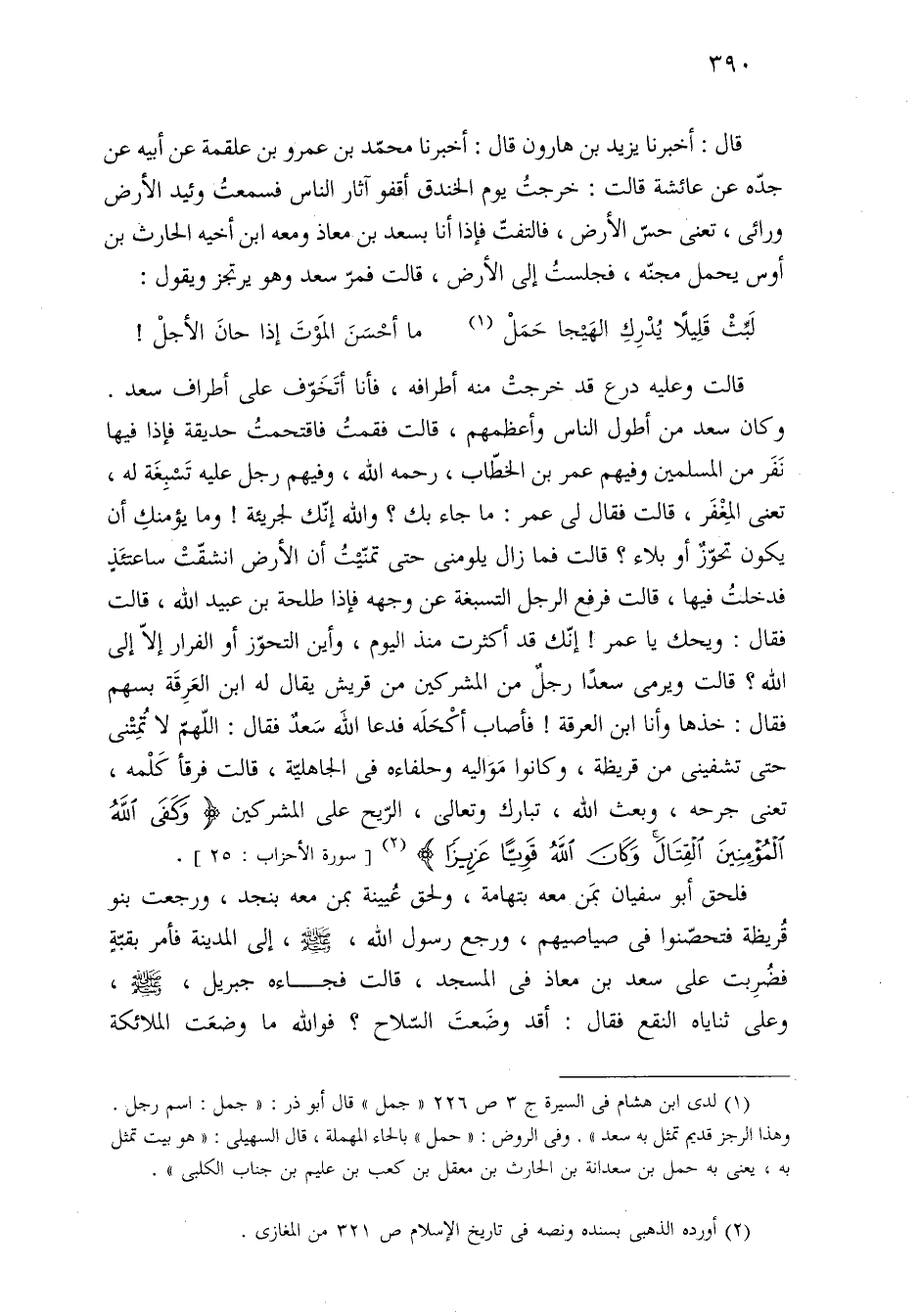 وكان سعد من أطول الناس وأعظمهم، قالت فقمتُ فاقتحمتُ حديقة فإذا فيها نَفَر من المسلمين وفيهم عمر بن الخطّاب، رحمه الله، وفيهم رجل عليه تَسْبِغَة له، تعنى المِغْفَر، قالت فقال لى عمر: ما جاء بك؟ والله إنّك لجريئة! وما يؤمنكِ أن يكون تحوّزٌ أو بلاء؟ قالت فما زال يلومنى حتى تمنّيْتُ أن الأرض انشقّتْ ساعتئَذٍ فدخلتُ فيها، قالت فرفع الرجل التسبغة عن وجهه فإذا طلحة بن عبيد الله، قالت فقال: ويحك يا عمر! إنّك قد أكثرت منذ اليوم، وأين التحوّز أو الفرار إلّا إلى الله؟ قالت ويرمى سعدًا رجلٌ من المشركين من قريش يقال له ابن العَرِقَة بسهم فقال: خذها وأنا ابن العرقة! فأصاب أكْحَلَه فدعا اللَّه سَعدٌ فقال: اللهم لا تُمِتْنى حتى تشفينى من قريظة، وكانوا مَوَاليه وحلفاءه فى الجاهليّة، قالت فرقأ كَلْمه، تعنى جرحه، وبعث الله، تبارك وتعالى، الرّيح على المشركين {وَكَفَى اللَّهُ الْمُؤْمِنِينَ الْقِتَالَ وَكَانَ اللَّهُ قَوِيًّا عَزِيزًا} (¬٢) [سورة الأحزاب: ٢٥].