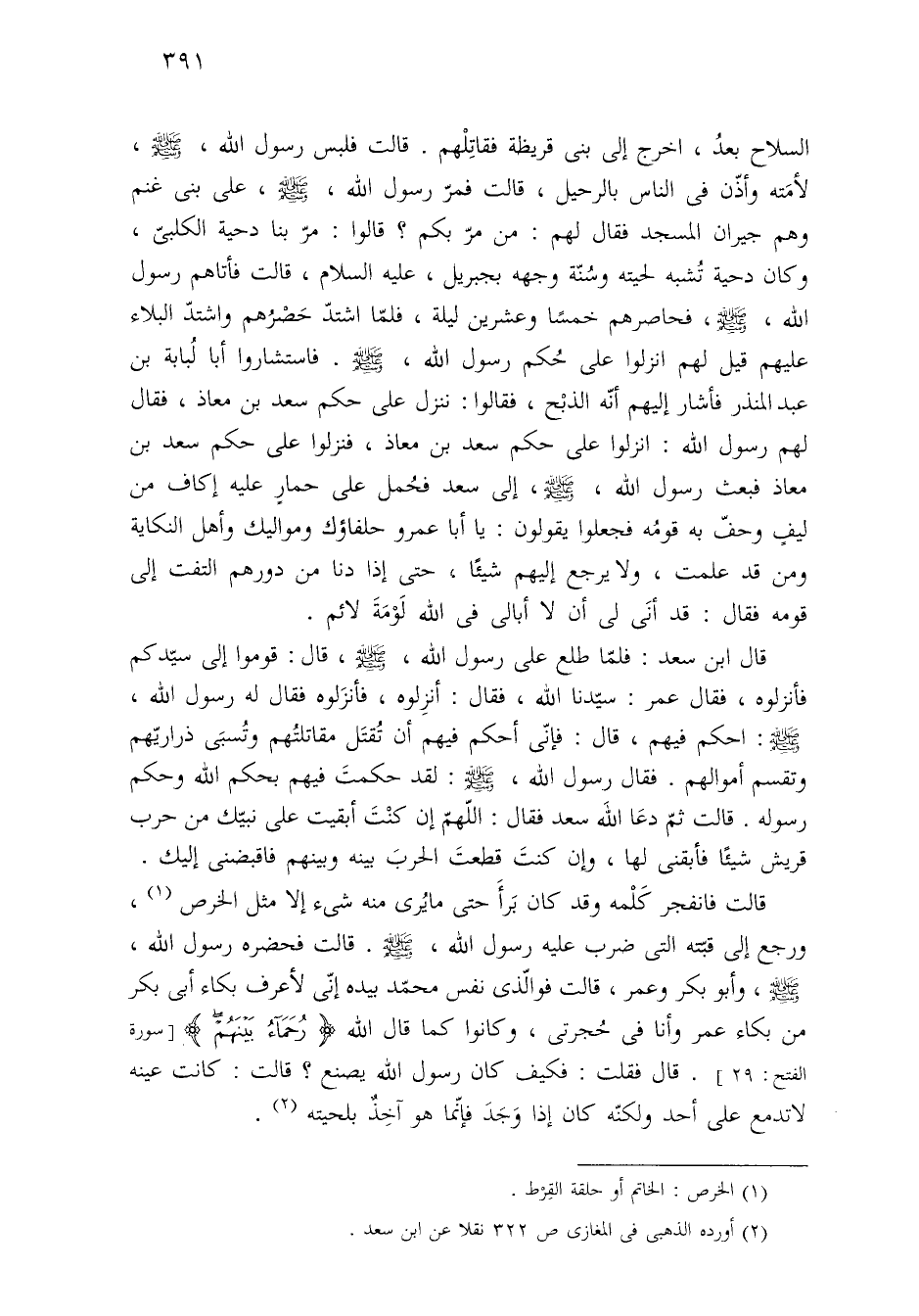 السلاح بعدُ، اخرج إلى بنى قريظة فقاتِلْهم. قالت فلبس رسول الله، -صلى الله عليه وسلم-، لأمَته وأذّن فى الناس بالرحيل، قالت فمرّ رسول، -صلى الله عليه وسلم-، على بنى غنم وهم جيران المسجد فقال لهم: من مرّ بكم؟ قالوا: مرّ بنا دحية الكلبى، وكان دحية تُشبه لحيته وسُنّة وجهه بجبريل، عليه السلام، قالت فأتاهم رسول الله، -صلى الله عليه وسلم-، فحاصرهم خمسًا وعشرين ليلة، فلمّا اشتدّ حَصْرُهم واشتدّ البلاء عليهم قيل لهم انزلوا على حُكم رسول، -صلى الله عليه وسلم-. فاستشاروا أبا لُبابة بن عبد المنذر فأشار إليهم أنّه الذبْح، فقالوا: ننزل على حكم سعد بن معاذ، فقال لهم رسول الله: انزلوا على حكم سعد بن معاذ، فنزلوا على حكم سعد بن معاذ فبعث رسول الله، -صلى الله عليه وسلم-، إلى سعد فحُمل على حمارٍ عليه إكاف من ليفٍ وحفّ به قومُه فجعلوا يقولون: يا أبا عمرو حلفاؤك ومواليك وأهل النكاية ومن قد علمت، ولا يرجع إليهم شيئًا، حتى إذا دنا من دورهم التفت إلى قومه فقال: قد أنَى لى أن لا أبالى فى الله لَوْمَةَ لائم.