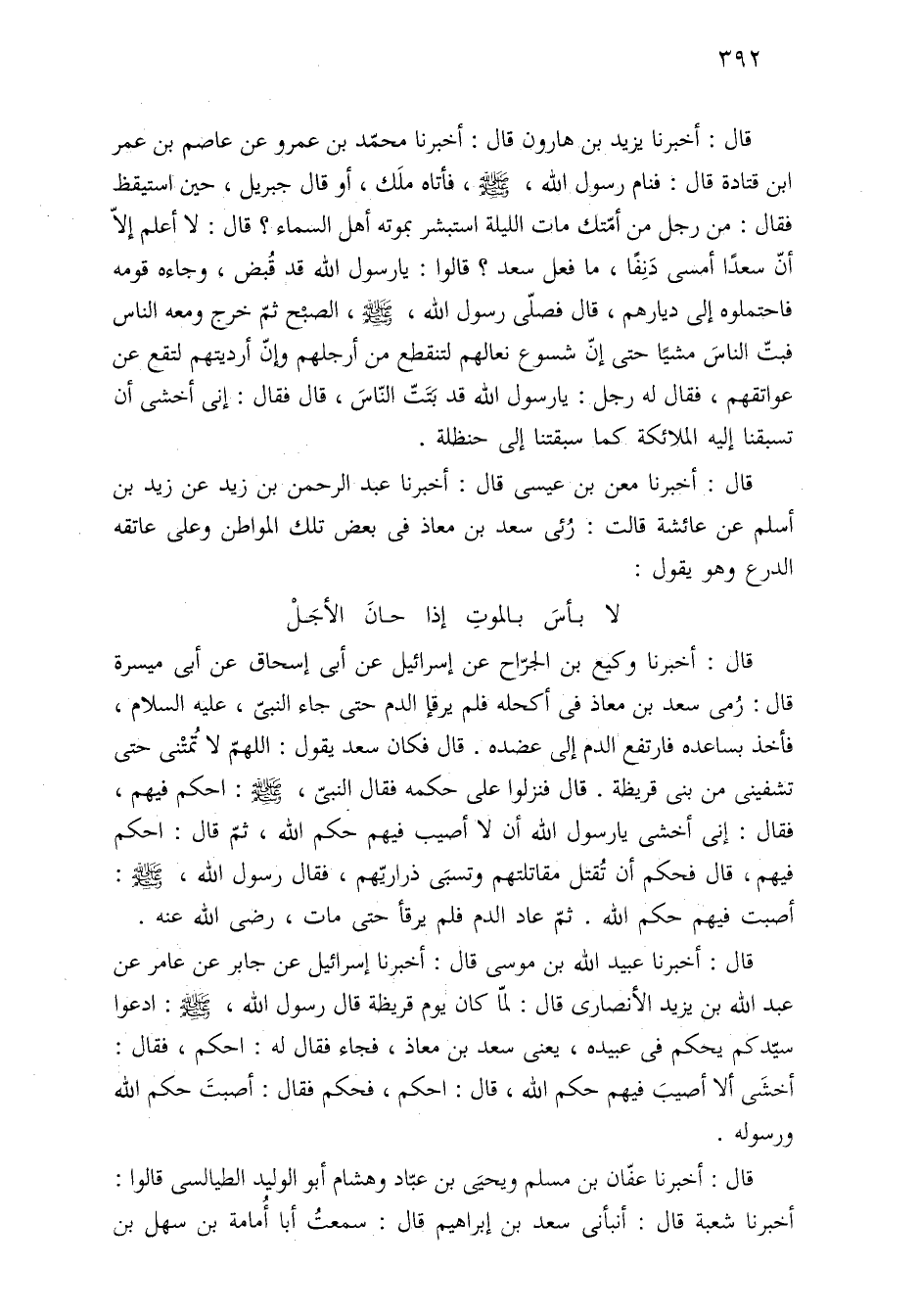 قال: أخبرنا يزيد بن هارون قال: أخبرنا محمّد بن عمرو عن عاصم بن عمر ابن قتادة قال: فنام رسول الله، -صلى الله عليه وسلم-، فأتاه ملَك، أو قال جبريل، حين استيقظ فقال: من رجل من أمّتك مات الليلة استبشر بموته أهل السماء؟ قال: لا أعلم إلّا أنّ سعدًا أمسى دَنِفًا، ما فعل سعد؟ قالوا: يا رسول الله قد قُبض، وجاءه قومه فاحتملوه إلى ديارهم، قال فصلّى رسول الله، -صلى الله عليه وسلم-، الصبْح ثمّ خرج ومعه الناس فبتّ الناسَ مشيًا حتى إنّ شسوع نعالهم لتنقطع من أرجلهم وإنّ أرديتهم لتقع عن عواتقهم، فقال له رجل: يارسول الله قد بَتَتّ النّاسَ، قال فقال: إنى أخشى أن تسبقنا إليه الملائكة كما سبقتنا إلى حنظلة.