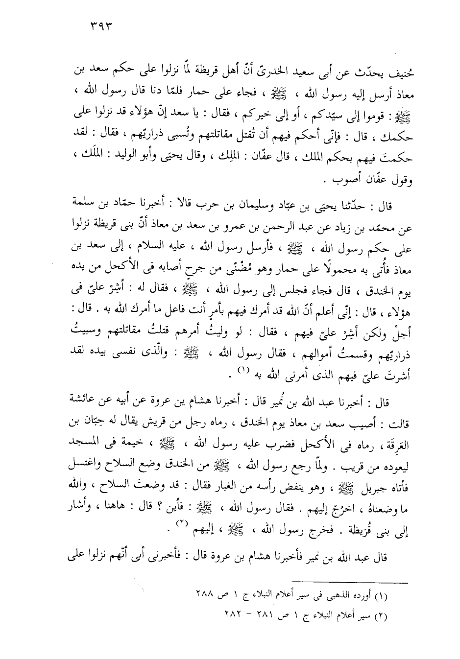 قال: حدّثنا يحيَى بن عبّاد وسليمان بن حرب قالا: أخبرنا حمّاد بن سلمة عن محمّد بن زياد عن عبد الرحمن بن عمرو بن سعد بن معاذ أنّ بنى قريظة نزلوا على حكم رسول الله، -صلى الله عليه وسلم-، فأرسل رسول الله، عليه السلام، إلى سعد بن معاذ فأُتى به محمولًا على حمار وهو مُضْنًى من جرحٍ أصابه في الأكحل من يده يوم الخندق، قال فجاء فجلس إلى رسول الله، -صلى الله عليه وسلم-، فقال له: أشِرْ علىّ في هؤلاء، قال: إنّى أعلم أنّ الله قد أمرك فيهم بأمرٍ أنت فاعل ما أمرك الله به. قال: أجلْ ولكن أشِرْ عليّ فيهم، فقال: لو وليتُ أمرهم قتلتُ مقاتلتهم وسبيتُ ذراريّهم وقسمتُ أموالهم، فقال رسول الله، -صلى الله عليه وسلم-: والّذى نفسى بيده لقد أشرتَ عليّ فيهم الذى أمرنى الله به (¬١).