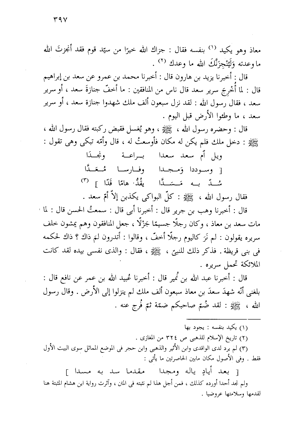 (¬٣) لم يرد لدى الواقدى وابن الأثير والذهبى وابن حجر في الموضع المماثل سوى البيت الأول فقط. وفى الأصول مكان ما بين الحاصرتين ما يأتى: