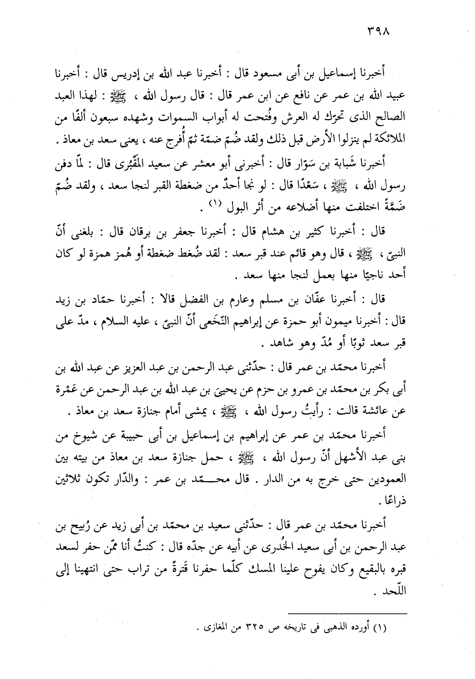 أخبرنا إسماعيل بن أبي مسعود قال: أخبرنا عبد الله بن إدريس قال: أخبرنا عبيد الله بن عمر عن نافع عن ابن عمر قال: قال رسول الله، -صلى الله عليه وسلم-: لهذا العبد الصالح الذى تحرّك له العرش وفُتحت له أبواب السموات وشهده سبعون ألفًا من الملائكة لم ينزلوا الأرض قبل ذلك ولقد ضُمّ ضمّة ثمّ أُفرج عنه، يعنى سعد بن معاذ.