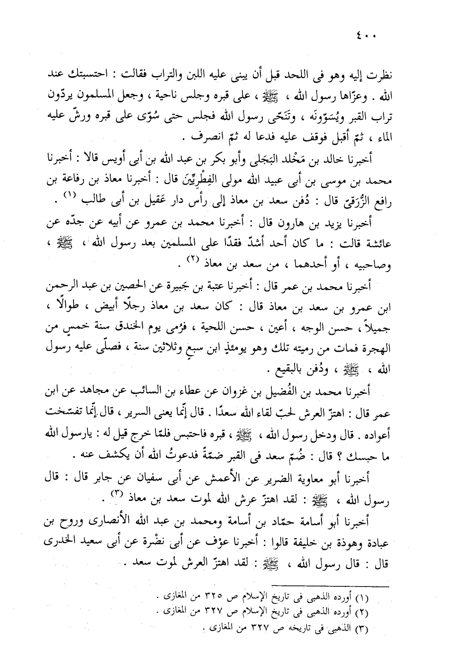 أخبرنا أبو أسامة حمّاد بن أسامة ومحمد بن عبد الله الأنصارى وروح بن عبادة وهوذة بن خليفة قالوا: أخبرنا عوْف عن أبي نضْرة عن أبي سعيد الخدرى قال: قال رسول الله، -صلى الله عليه وسلم-: لقد اهتزّ العرش لموت سعد.