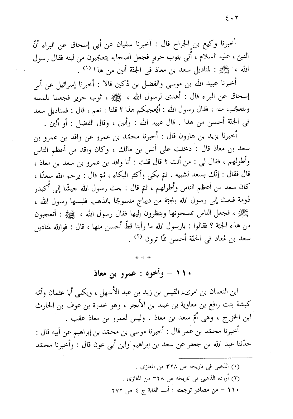 أخبرنا وكيع بن الجراح قال: أخبرنا سفيان عن أبى إسحاق عن البراء أنّ النبىّ، عليه السلام، أُتى بثوب حريرٍ فجعل أصحابه يتعجّبون من لينه فقال رسول الله، -صلى الله عليه وسلم-: لمناديل سعد بن معاذ في الجنّة ألين من هذا (¬١).