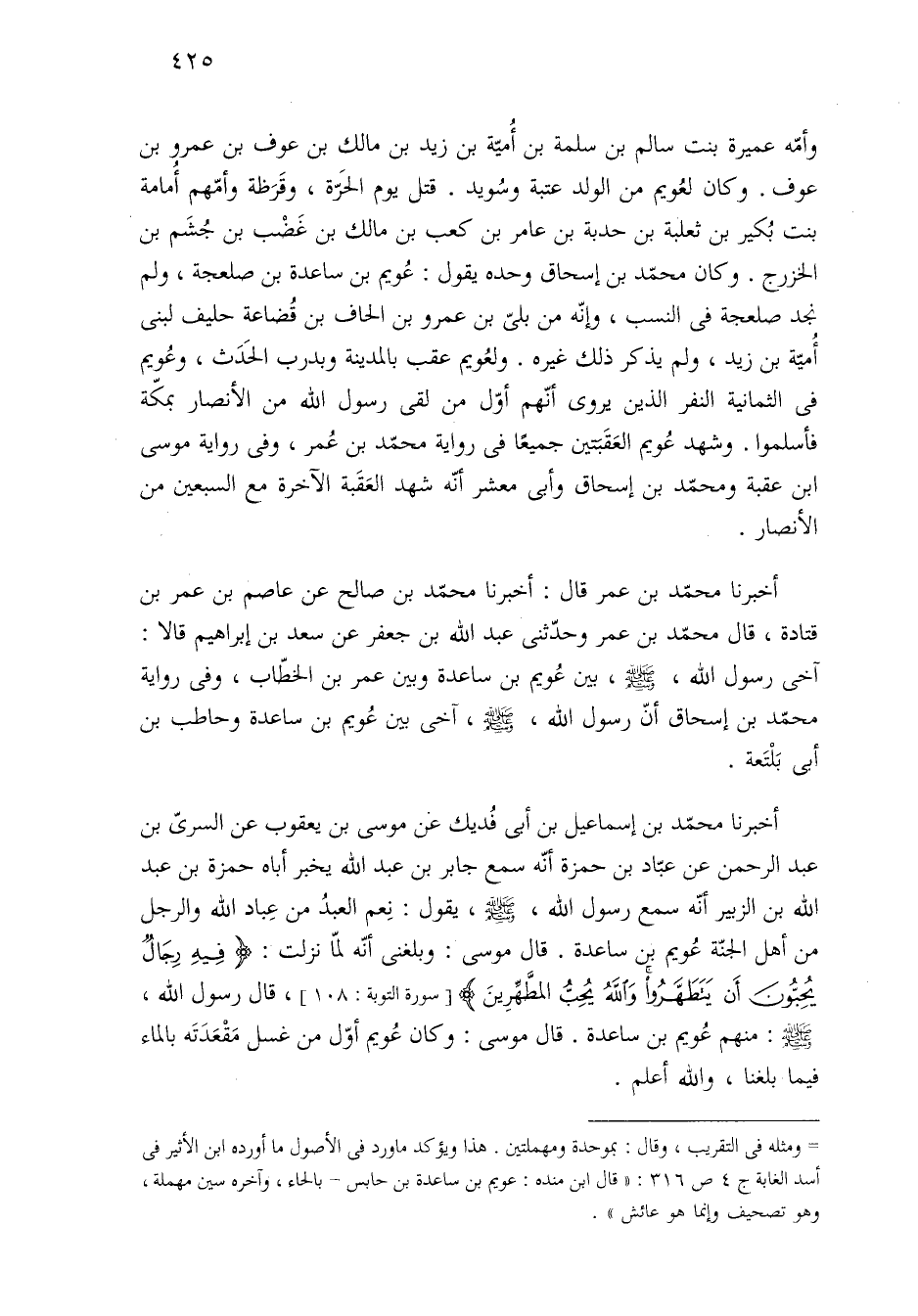 أخبرنا محمّد بن إسماعيل بن أبي فُديك عن موسى بن يعقوب عن السرىّ بن عبد الرحمن عن عبّاد بن حمزة أنّه سمع جابر بن عبد الله يخبر أباه حمزة بن عبد الله بن الزبير أنّه سمع رسول الله، -صلى الله عليه وسلم-، يقول: نِعم العبدُ من عِباد الله والرجل من أهل الجنّة عُويم بن ساعدة. قال موسى: وبلغنى أنّه لمّا نزلت: {فِيهِ رِجَالٌ يُحِبُّونَ أَنْ يَتَطَهَّرُوا وَاللَّهُ يُحِبُّ الْمُطَّهِّرِينَ} [سورة التوبة: ١٠٨]، قال رسول الله، -صلى الله عليه وسلم-: منهم عُويم بن ساعدة. قال موسى: وكان عُويم أوّل من غسل مَقْعَدَتَه بالماء فيما بلغنا، والله أعلم.