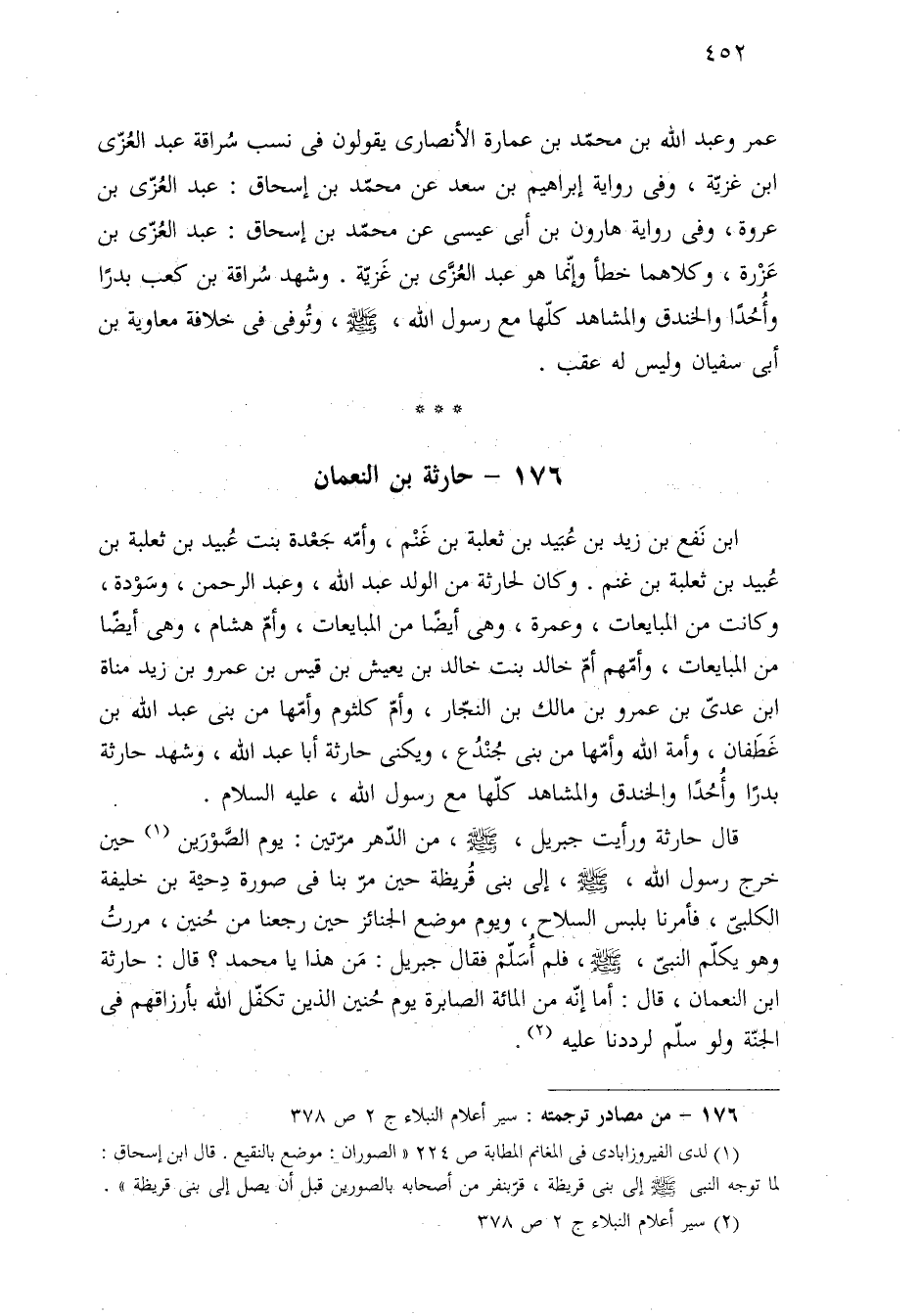 قال حارثة ورأيت جبريل، -صلى الله عليه وسلم-، من الدّهر مرّتين: يوم الصَّوْرَين (¬١) حين خرج رسول الله، -صلى الله عليه وسلم-، إلى بنى قُريظة حين مرّ بنا فى صورة دِحيْة بن خليفة الكلبىّ، فأمرنا بلبس السلاح، ويوم موضع الجنائز حين رجعنا من حُنين، مررتُ وهو يكلّم النبيّ، -صلى الله عليه وسلم-، فلم أُسَلّمْ فقال جبريل: مَن هذا يا محمد؟ قال: حارثة ابن النعمان، قال: أما إنّه من المائة الصابرة يوم حُنين الذين تكفّل الله بأرزاقهم فى الجنّة ولو سلّم لرددنا عليه (¬٢).