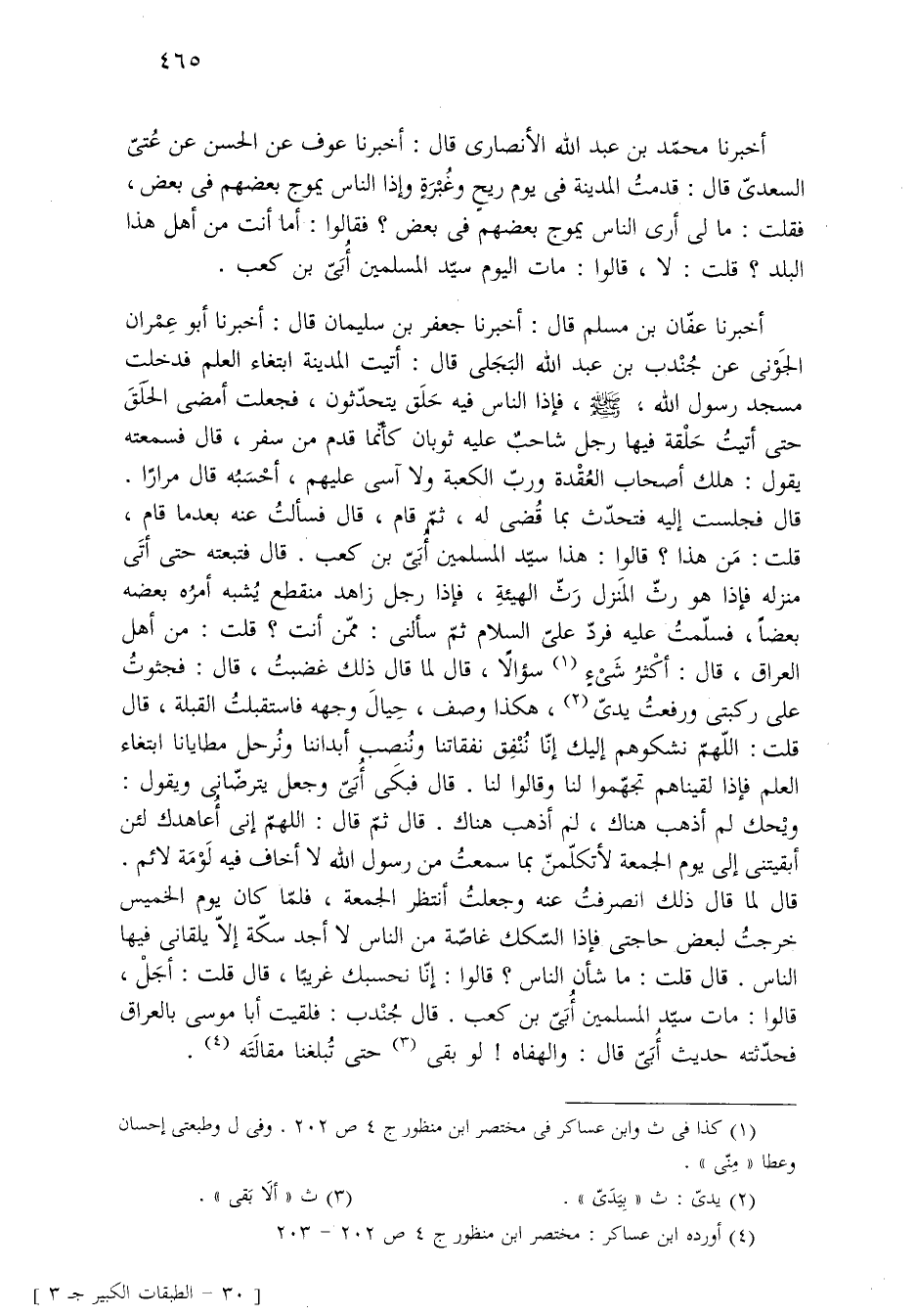 أخبرنا محمّد بن عبد الله الأنصارى قال: أخبرنا عوف عن الحسن عن عُتىّ السعدىّ قال: قدمتُ المدينة فى يوم ريحٍ وغُبْرَةٍ وإذا الناس يموج بعضهم فى بعض، فقلت: ما لى أرى الناس يموج بعضهم فى بعض؟ فقالوا: أما أنت من أهل هذا البلد؟ قلت: لا، قالوا: مات اليوم سيّد المسلمين أُبَىّ بن كعب.
