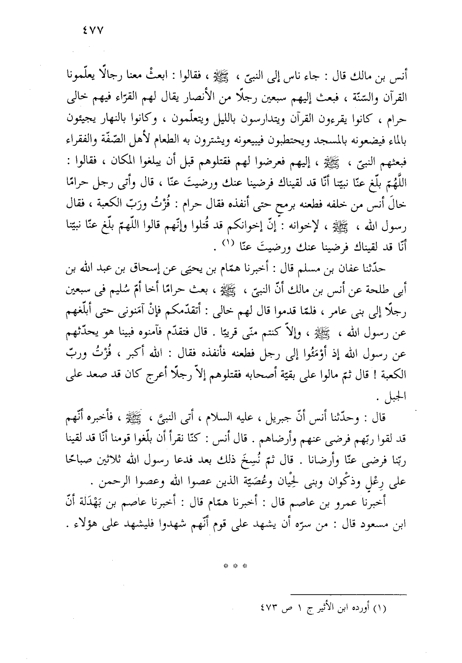 حدّثنا عفان بن مسلم قال: أخبرنا همّام بن يحيى عن إسحاق بن عبد الله بن أبى طلحة عن أنس بن مالك أنّ النبىّ، -صلى الله عليه وسلم-، بعث حرامًا أخا أمّ سُليم فى سبعين رجلًا إلى بنى عامر، فلمّا قدموا قال لهم خالى: أتقدّمكم فإنْ آمَنونى حتى أبلّغهم عن رسول الله، -صلى الله عليه وسلم-، وإلّا كنتم منّى قريبًا. قال فتقدّم فآمنوه فبينا هو يحدّثهم عن رسول الله إذ أوْمَئُوا إلى رجل فطعنه فأنفذه فقال: الله أكبر، فُزْتُ وربّ الكعبة! قال ثمّ مالوا على بقيّة أصحابه فقتلوهم إلّا رجلًا أعرج كان قد صعد على الجبل.