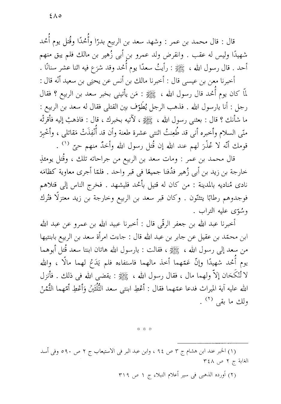 أخبرنا عبد الله بن جعفر الرقّى قاق: أخبرنا عبيد الله بن عمرو عن عبد الله ابن محمّد بن عقيل عن جابر بن عبد الله قال: جاءت امرأة سعد بن الربيع بابنتيها من سعد إلى رسول الله، -صلى الله عليه وسلم-، فقال: يا رسول الله هاتان ابنتا سعد قُتل أبوهما يوم أُحُد شهيدًا وإنّ عَمّهما أخذ مالهصا فاستفاءه فلم يَدَعْ لهما مالًا، والله لا تُنْكَحَان إِلَّا ولهما مال، فقال رسول الله، -صلى الله عليه وسلم-: يقضى الله في ذلك، فأنزل الله عليه آية الميراث فدعا عمّهما فقال: أعْطِ ابنتى سعد الثُّلُثَينْ وَأعْطِ أمّهما الثُّمُنْ ولك ما بقى (¬٢).