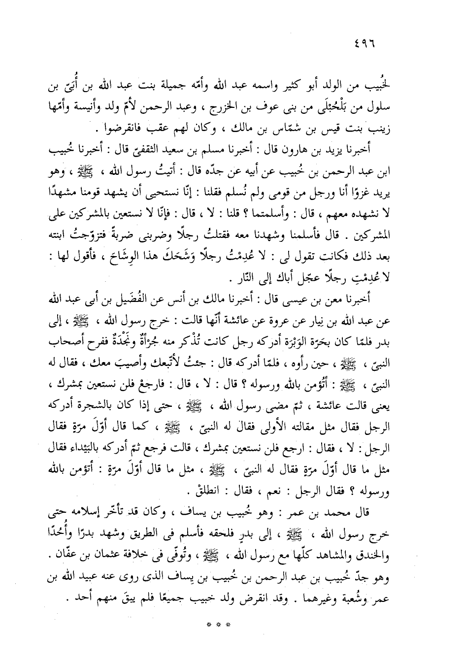 أخبرنا معن بن عيسى قال: أخبرنا مالك بن أنس عن الفُضَيل بن أبي عبد الله عن عبد الله بن نِيار عن عروة عن عائشة أنّها قالت: خرج رسول الله، -صلى الله عليه وسلم-، إلى بدر فلمّا كان بحَرّة الوَبْرَة أدركه رجل كانت تُذْكر منه جُزأةٌ ونَجْدَةٌ ففرح أصحاب النبيّ، -صلى الله عليه وسلم-، حين رأوه، فلمّا أدركه قال: جئتُ لأتّبعك وأصيبَ معك، فقال له النبيّ، -صلى الله عليه وسلم-: أتُؤمن بالله ورسوله؟ قال: لا، قال: فارجعْ فلن نستعين بمشرك، يعنى قالت عائشة، ثمّ مضى رسول الله، -صلى الله عليه وسلم-، حتّى إذا كان بالشجرة أدركه الرجل فقال مثل مقالته الأولى فقال له النبىّ، -صلى الله عليه وسلم-، كما قال أوّلَ مرّةٍ فقال الرجل: لا، فقال: ارجع فلن نستعين بمشرك، قالت فرجع ثمّ أدركه بالبَيْداء فقال مثل ما قال أوّلَ مرّةٍ فقال له النبىّ، -صلى الله عليه وسلم-، مثل ما قال أوّلَ مرّةٍ: أتؤمن بالله ورسوله؟ فقال الرجل: نعم، فقال: انطلقْ.