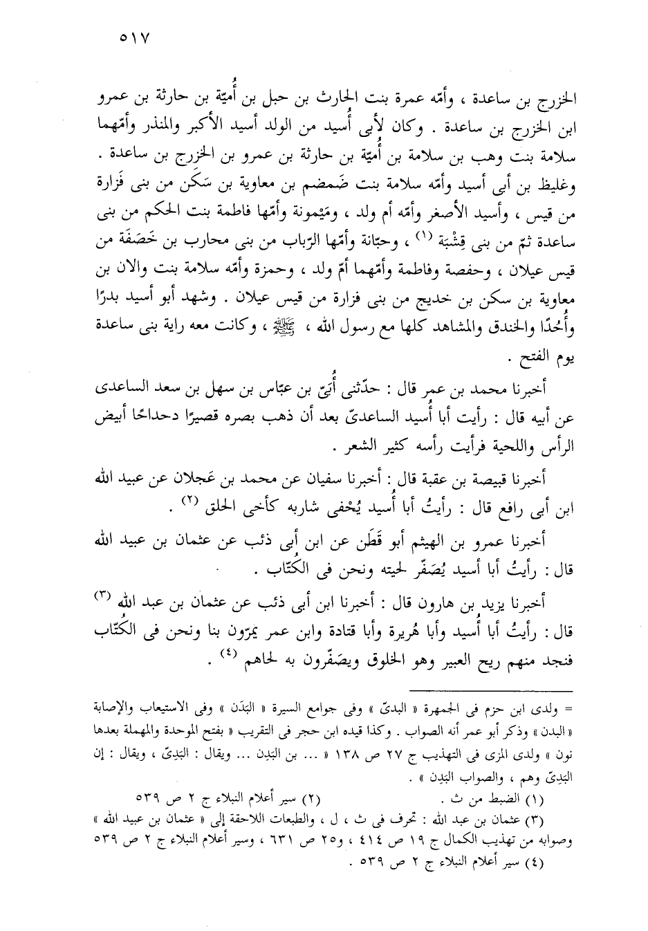 أخبرنا محمّد بن عمر قال: حدّثنى أُبَيّ بن عبّاس بن سهل بن سعد الساعدى عن أبيه قال: رأيت أبا أُسيد الساعديّ بعد أن ذهب بصره قصيرًا دحداحًا أبيض الرأس واللحية فرأيت رأسه كثير الشعر.