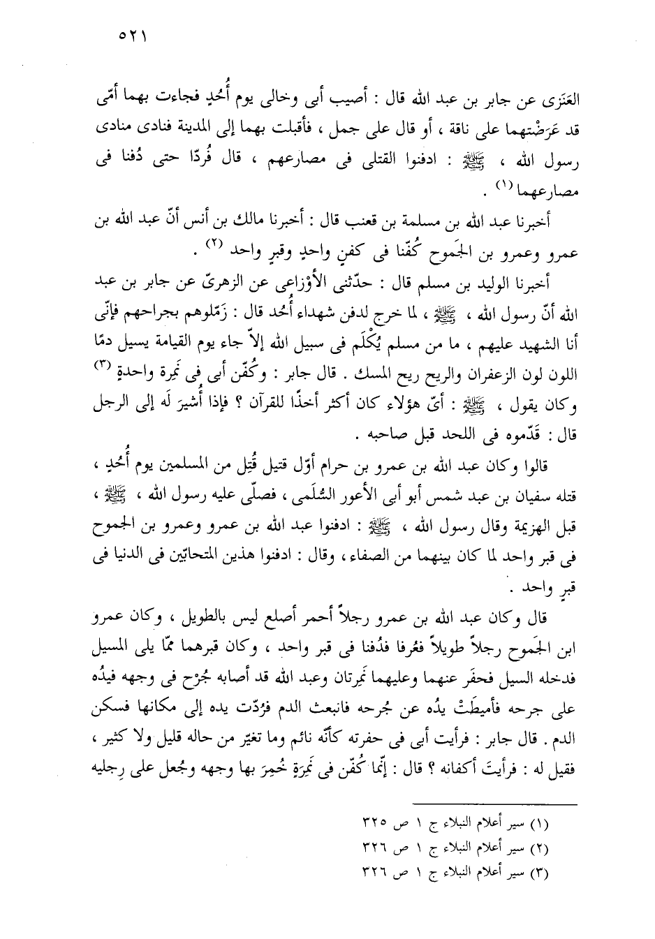 قال وكان عبد الله بن عمرو رجلًا أحمر أصلع ليس بالطويل، وكان عمرو ابن الجَموح رجلًا طويلًا فعُرفا فدُفنا في قبر واحد، وكان قبرهما ممّا يلى المسيل فدخله السيل فحفَر عنهما وعليهما نَمِرتان وعبد الله قد أصابه جُرْح في وجهه فيدُه على جرحه فأميطَتْ يدُه عن جُرحه فانبعث الدم فرُدّت يده إلى مكانها فسكن الدم. قال جابر: فرأيت أبى في حفرته كأنه نائم وما تغيّر من حاله قليل ولا كثير، فقيل له: فرأيتَ أكفانه؟ قال: إنّما كُفّن في نَمِرَةٍ خُمِرَ بها وجهه وجُعل على رِجليه