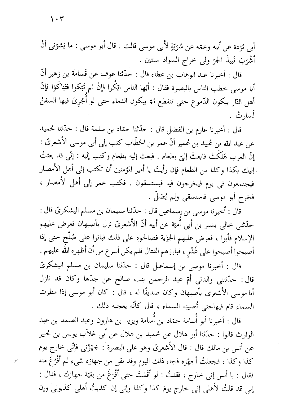 قال: أخبرنا أبو أُسامة حمّاد بن أُسامة ويزيد بن هارون وعبد الصمد بن عبد الوارث قالوا: حدّثنا أبو هلال عن حُميد بن هلاِل عن أبى غلّاب يونس بن جُبير عن أنس بن مالك قال: قال الأشعريّ وهو على البصرة: جَهّزْنى فإنّى خارج يوم كذا وكذا، فجعلتُ أجهّزه فجاء ذلك اليوم وقد بقي من جهازه شئ لم أفْرُغْ منه فقال: يا أنس إنى خارج، فقلتُ: لو أقَمْتَ حتى أفْرَغَ من بقيّة جهازك، فقال: إني قد قلتُ لأهلى إنى خارج يومَ كذا وكذا وإنى إن كذبتُ أهلى كذبونى وإن