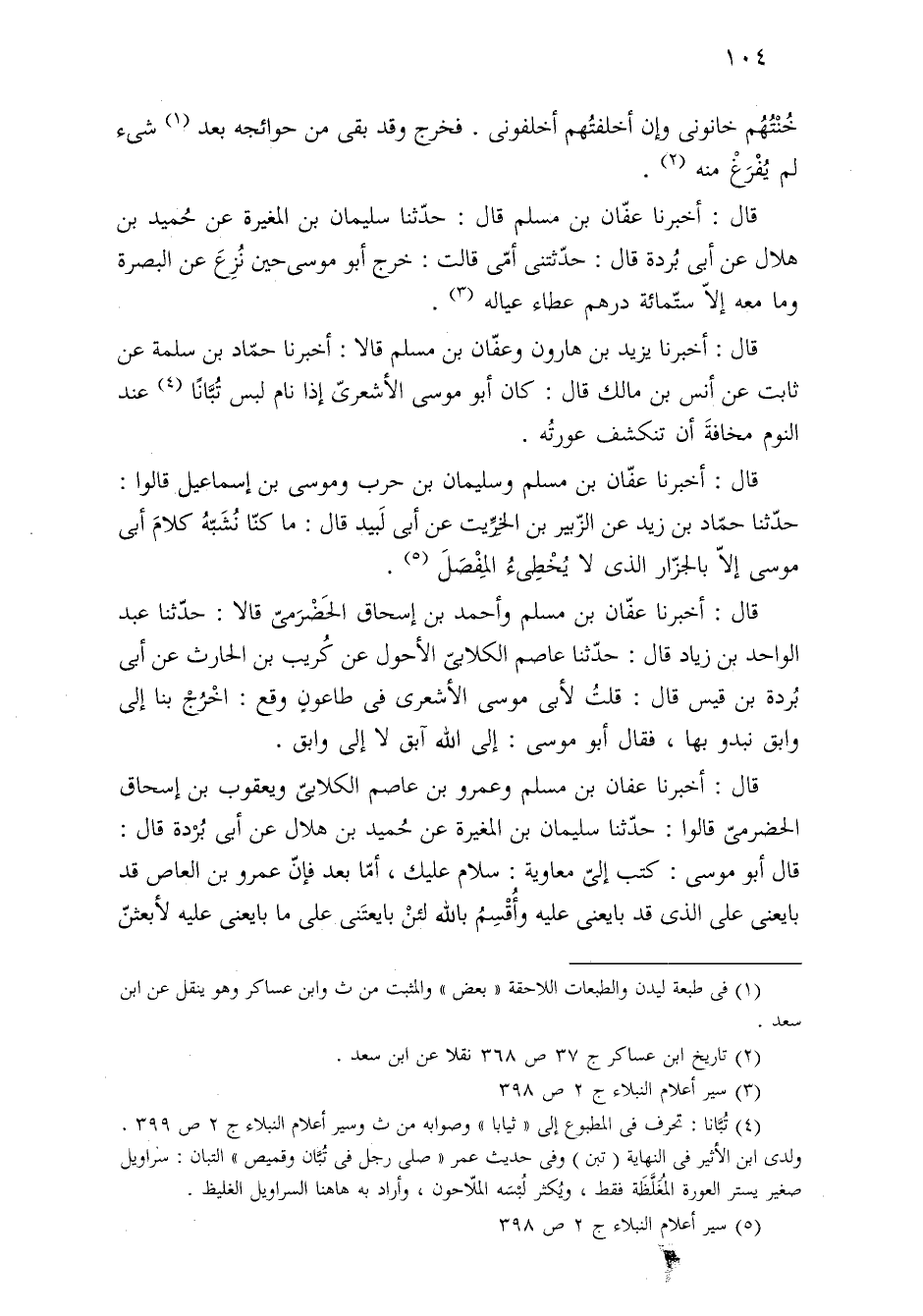 قال: أخبرنا عفان بن مسلم وعمرو بن عاصم الكلابيّ ويعقوب بن إسحاق الحضرميّ قالوا: حدّثنا سليمان بن المغيرة عن حُميد بن هلال عن أبى بُرْدة قال: قال أبو موسى: كتب إلىّ معاوية: سلام عليك، أمّا بعد فإنّ عمرو بن العاص قد بايعنى على الذى قد بايعنى عليه وأُقْسِمُ بالله لئنْ بايعتَنى على ما بايعنى عليه لأبعثنّ