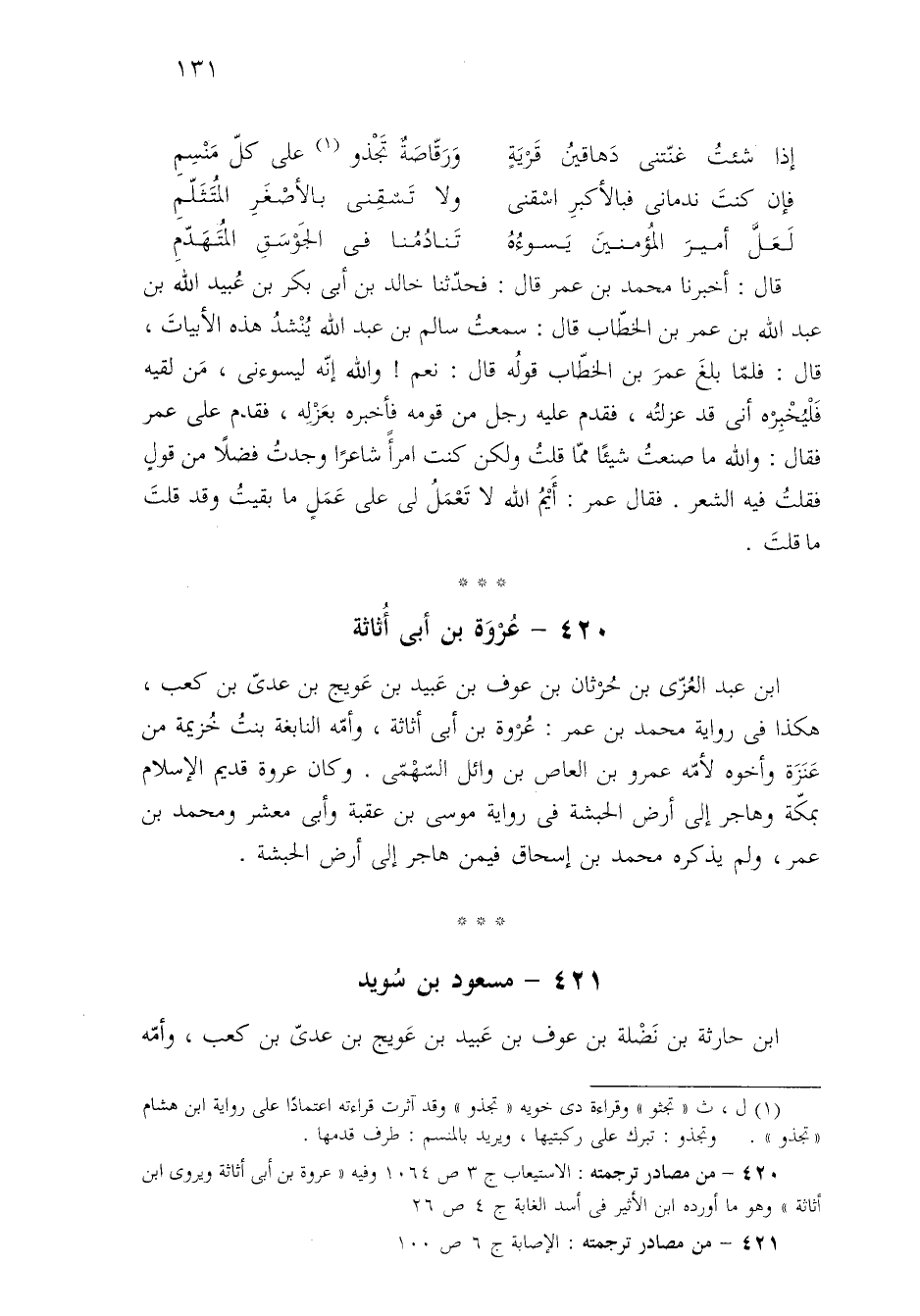 ٤٢٠ - من مصادر ترجمته: الاستيعاب ج ٣ ص ١٠٦٤ وفيه "عروة بن أبي أثاثة ويروى ابن أثاثة" وهو ما أورده ابن الأثير فى أسد الغابة ج ٤ ص ٢٦.