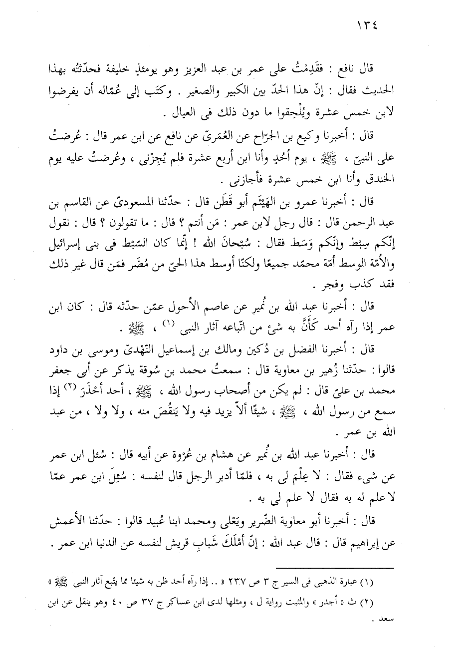 قال: أخبرنا وكيع بن الجرّاح عن العُمَرىّ عن نافع عن ابن عمر قال: عُرضتُ على النبيّ، -صلى الله عليه وسلم-، يوم أحُدٍ وأنا ابن أربع عشرة فلم يُجِزْنى، وعُرضتُ عليه يوم الخندق وأنا ابن خمش عشرة فأجازنى.