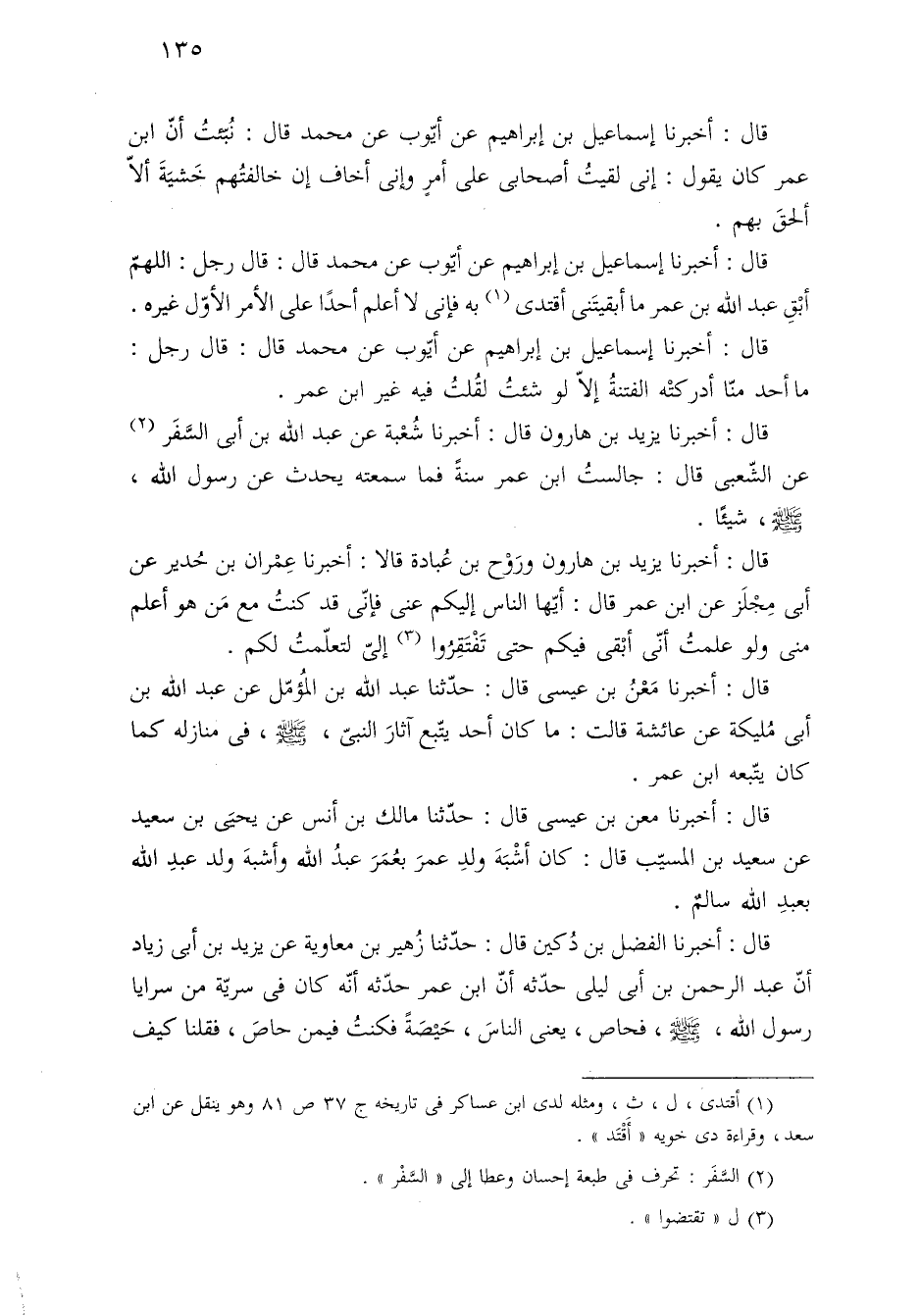 قال: أخبرنا معن بن عيسى قال: حدّثنا مالك بن أنس عن يحيىَ بن سعيد عن سعيد بن المسيّب قال: كان أشْبَهَ ولدِ عمرَ بعُمَرَ عبدُ الله وأشبهَ ولد عبدِ الله بعبدِ الله سالمٌ.