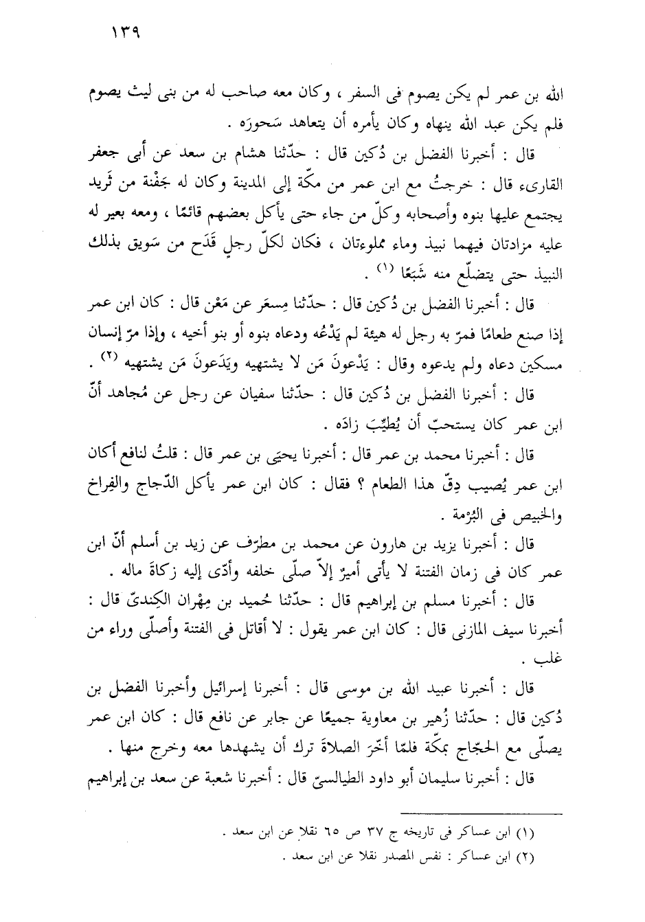 قال: أخبرنا محمد بن عمر قال: أخبرنا يحيَى بن عمر قال: قلتُ لنافع أكان ابن عمر يُصيب دِقّ هذا الطعام؟ فقال: كان ابن عمر يأكل الدّجاج والفِراخ والخبيص في البُرْمة.