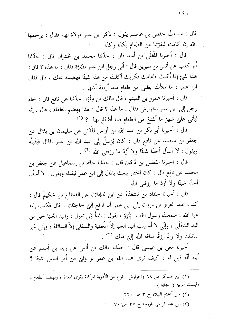 قال: أخبرنا المُعَلّى بن أسد قال: حدّثنا محمد بن حُمْران قال: حدّثنا أبو كعب عن أنس بن سيرين قال: أتَى رجل ابن عمر بصُرَّة فقال: ما هذه؟ قال: هذا شئ إذا أكلتَ طعامك فكربك أكلتَ من هذا شيئًا فهضمه عنك، قال فقال ابن عمر: ما ملأتُ بطنى من طعام منذ أربعة أشهر.