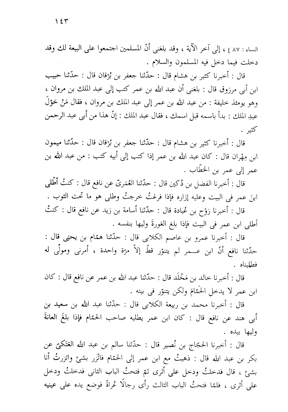 قال: أخبرنا الحجّاج بن نُصير قال: حدّثنا سالم بن عبد الله العَتَكيّ عن بكر بن عبد الله قال: ذهبتُ مع ابن عمر إلى الحمّام فاتّزر بشئ واتزرتُ أنا بشئ، قال فدخلتُ ودخل على أثرى ثمّ فتحتُ الباب الثانى فدخلتُ ودخل على أثرى، فلمّا فتحتُ الباب الثالث رأى رجالًا عُراةً فوضع يده على عينيه