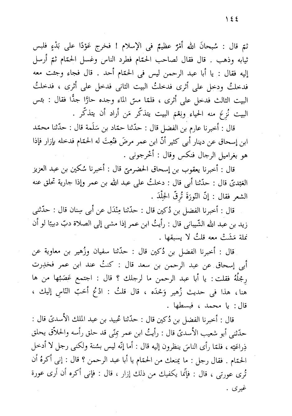 قال: أخبرنا الفضل بن دُكين قال: حدّثنا عُبيد بن عبد الملك الأسدىّ قال: حدّثنى أبو شعيب الأسديّ قال: رأيتُ ابن عمر بِمنًى قد حلق رأسه والحلّاق يحلق ذِراعَيْه، فلمّا رأى الناسَ ينظرون إليه قال: أما إنّه ليس بسُنة ولكنى رجل لا أدخل الحمّام. فقال رجل: ما يمنعك من الحمّام يا أبا عبد الرحمن؟ قال: إنى أكرهُ أن تُرى عورتى، قال: فإنّما يكفيك من ذلك إزار، دال: فإنى أكره أن أرى عورة غيري.