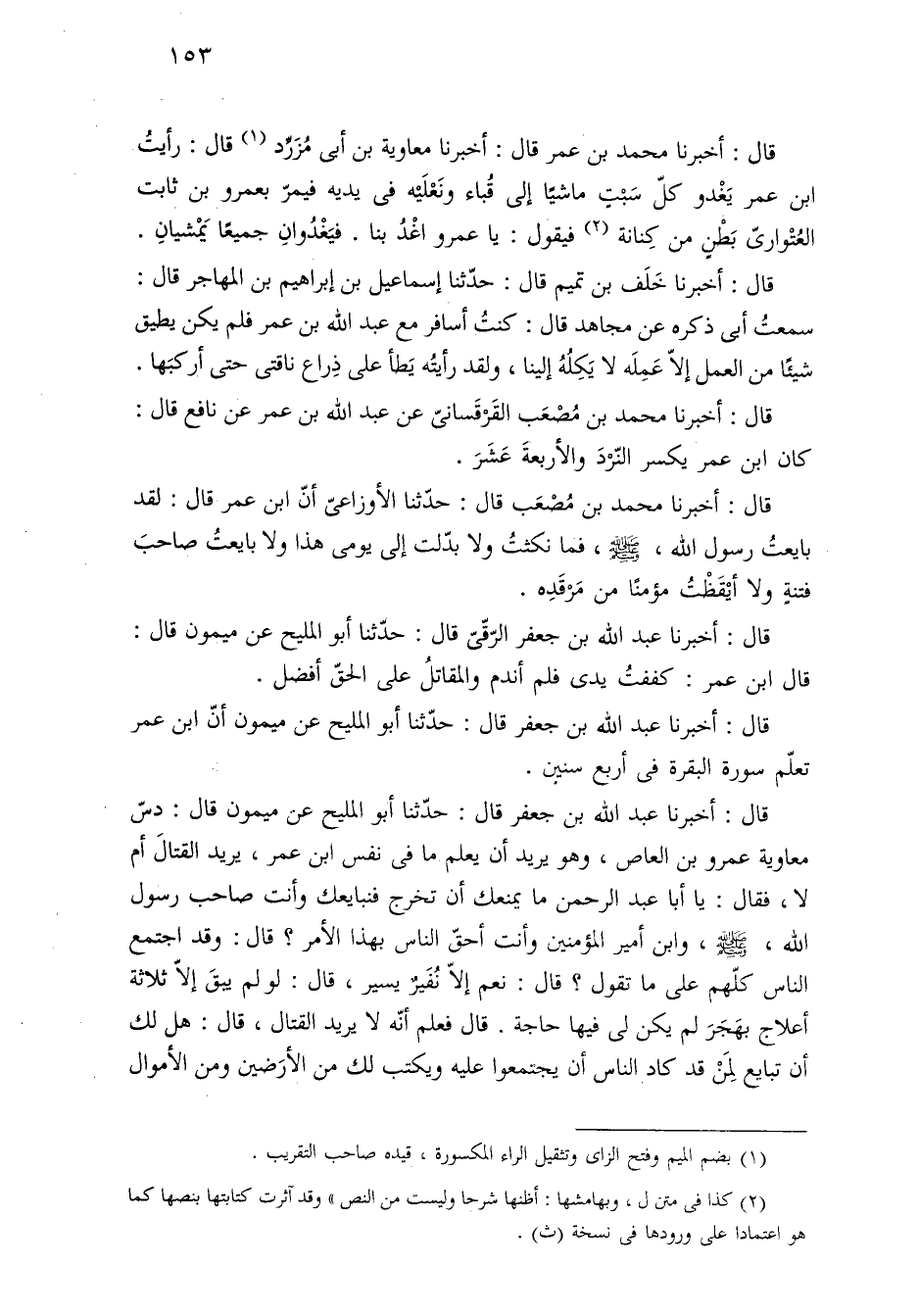 قال: أخبرنا عبد الله بن جعفر قال: حدّثنا أبو المليح عن ميمون قال: دسّ معاوية عمرو بن العاص، وهو يريد أن يعلم ما في نفس ابن عمر، يريد القتالَ أم لا، فقال: يا أبا عبد الرحمن ما يمنعك أن تخرج فنبايعك وأنت صاحب رسول الله، -صلى الله عليه وسلم-، وابن أمير المؤمنين وأنت أحقّ الناس بهذا الأمر؟ قال: وقد اجتمع الناس كلّهم على ما تقول؟ قال: نعم إلّا نُفَيرٌ يسير، قال: لو لم يبقَ إلّا ثلاثة أعلاج بهَجَرَ لم يكن لى فيها حاجة. قال فعلم أنّه لا يريد القتال، قال: هل لك أن تبايع لِمَنْ قد كاد الناس أن يجتمعوا عليه ويكتب لك من الأرَضين ومن الأموال