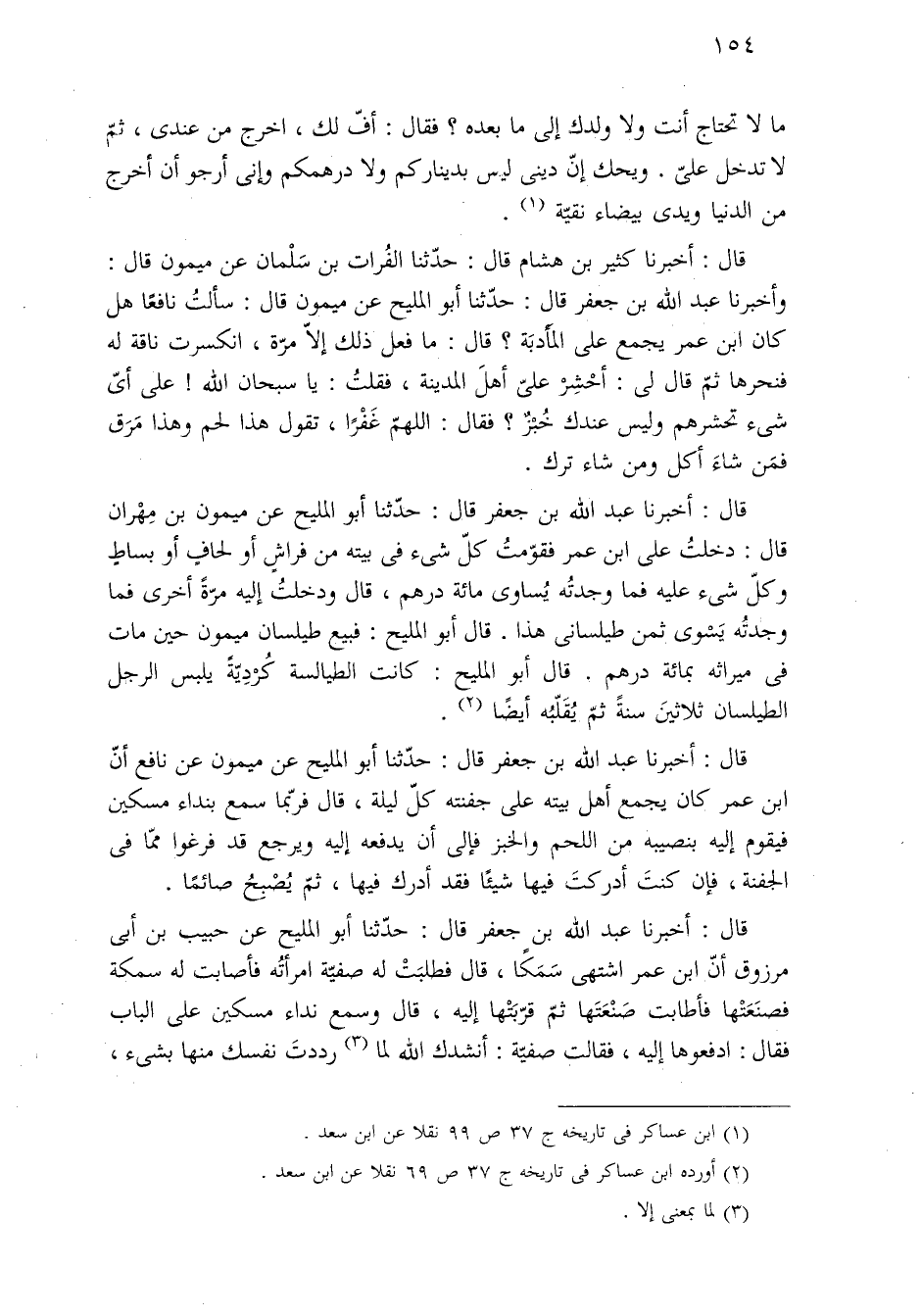 قال: أخبرنا كثير بن هشام قال: حدّثنا الفُرات بن سَلْمان عن ميمون قال: وأخبرنا عبد الله بن جعفر قال: حدّثنا أبو المليح عن ميمون قال: سألتُ نافعًا هل كان ابن عمر يجمع على المأَدبَة؟ قال: ما فعل ذلك إلّا مرّة، انكسرت ناقة له فنحرها ثمّ قال لى: أحْشِرْ عليّ أهلَ المدينة، فقلتُ: يا سبحان الله! على أىّ شئ تحشرهم وليس عندك خُبْزٌ؟ فقال: اللهمّ غَفْرًا، تقول هذا لحم وهذا مَرَق فمَن شاءَ أكل ومن شاء ترك.