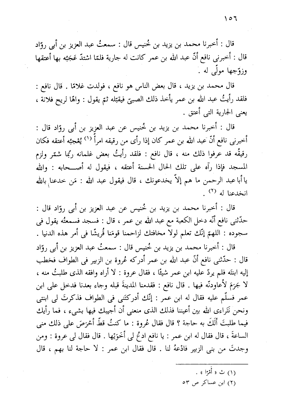 قال: أخبرنا محمد بن يزيد بن خُنيس قال: سمعتُ عبد العزيز بن أبي روّاد قال: أخبرنى نافع أنّ عبد الله بن عمر كانت له جارية فلمّا اشتدّ عَجَبُه بها أعتقها وزوّجها مولًى له.