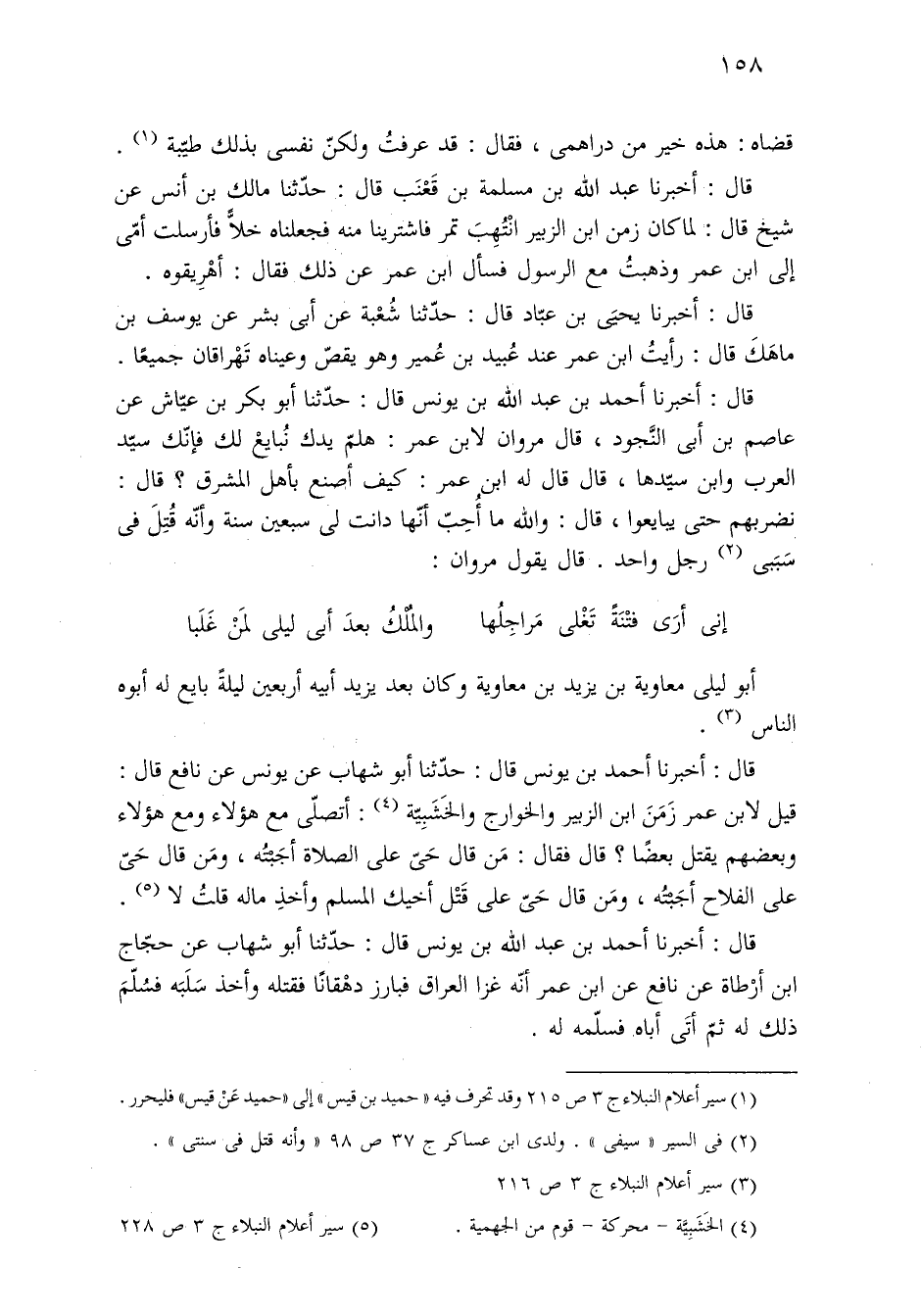 قال: أخبرنا أحمد بن يونس قال: حدّثنا أبو شهاب عن يونس عن نافع قال: قيل لابن عمر زَمَنَ ابن الزبير والخوارج والخَشَبِيّة (¬٤): أتصلّى مع هؤلاء ومع هؤلاء وبعضهم يقتل بعضًا؟ قال فقال: مَن قال حَىّ على الصلاة أجَبْتُه، ومَن قال حَىّ على الفلاح أجَبْتُه، ومَن قال حَىّ على قَتْل أخيك المسلم وأخذِ ماله قلتُ لا (¬٥).