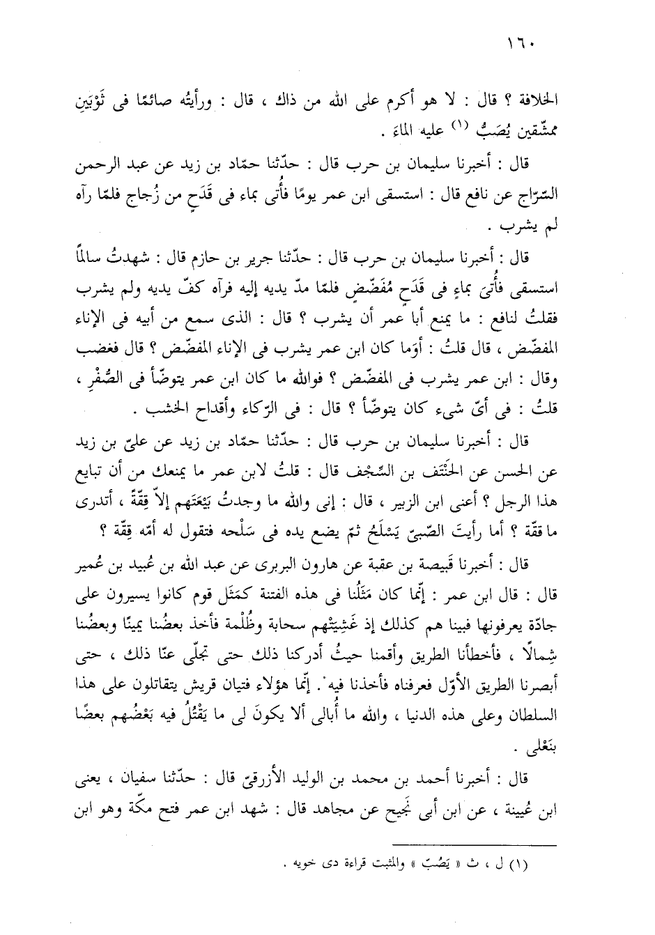قال: أخبرنا سليمان بن حرب قال: حدّثنا جرير بن حازم قال: شهدتُ سالمًا استسقى فأُتىَ بماءٍ في قَدَح مُفَضّضٍ فلمّا مدّ يديه إليه فرآه كفّ يديه ولم يشرب فقلتُ لنافع: ما يمنع أبا عمر أن يشرب؟ قال: الذى سمع من أبيه في الإناء المفضّض، قال قلتُ: أوَما كان ابن عمر يشرب في الإناء المفضّض؟ قال فغضب وقال: ابن عمر يشرب في المفضّض؟ فوالله ما كان ابن عمر يتوضّأ في الصُّفْرِ، قلتُ: في أىّ شئ كان يتوضّأ؟ قال: في الرّكاء وأقداح الخشب.