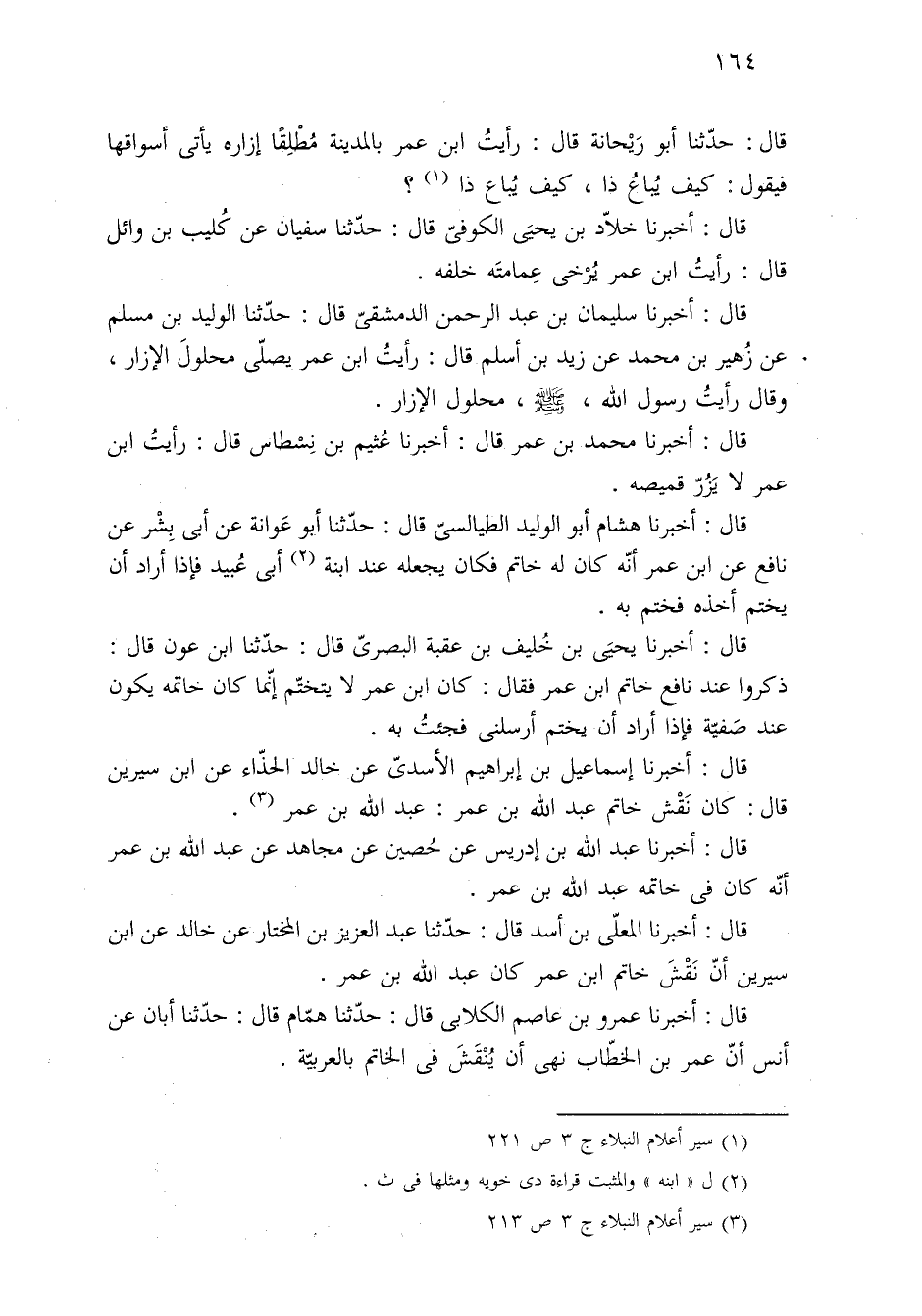 قال: أخبرنا يحيَى بن خُليف بن عقبة البصريّ قال: حدّثنا ابن عون قال: ذكروا عند نافع خاتم ابن عمر فقال: كان ابن عمر لا يتختّم إنّما كان خاتمه يكون عند صَفيّة فإذا أراد أن يختم أرسلنى فجئتُ به.