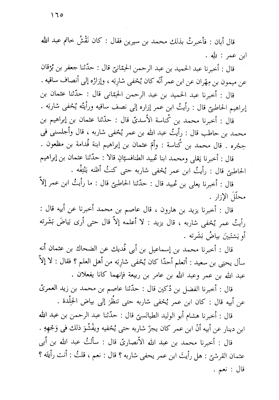 قال: أخبرنا محمد بن عبد الله الأنصاريّ قال: سألتُ عبد الله بن أبي عثمان القرشىّ: هل رأيتَ ابن عمر يحفى شاربه؟ قال: نعم، قلتُ: أنت رأيتَه؟ قال: نعم.