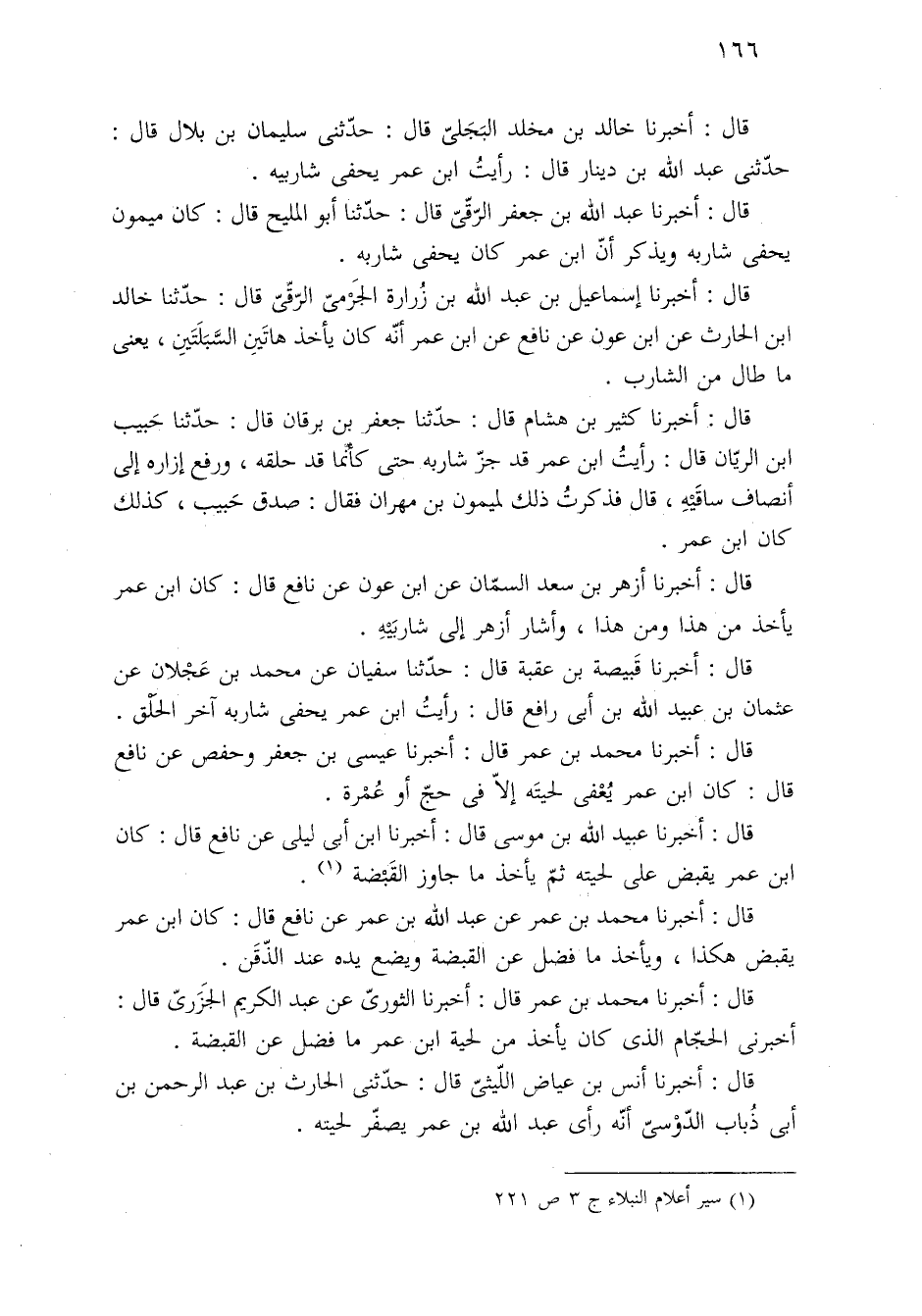 قال: أخبرنا محمد بن عمر قال: أخبرنا الثوريّ عن عبد الكريم الجَزَرىّ قال: أخبرنى الحجّام الذى كان يأخذ من لحية ابن عمر ما فضل عن القبضة.