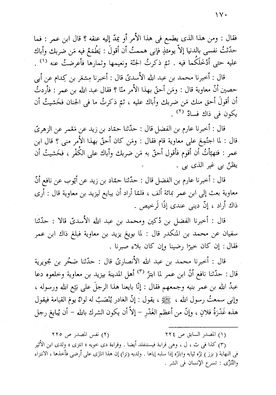 قال: أخبرنا محمد بن عبد الله الأسدىّ قال: أخبرنا مِسعَر بن كِدام عن أبي حصين أنّ معاوية قال: ومَن أحقّ بهذا الأمر منّا؟ فقال عبد الله بن عمر: فأردتُ أن أقولَ أحق منك مَن ضربك وأباك عليه، ثمّ ذكرتُ ما في الجنان فخَشيتُ أن يكون في ذاك فسادٌ (¬٢).