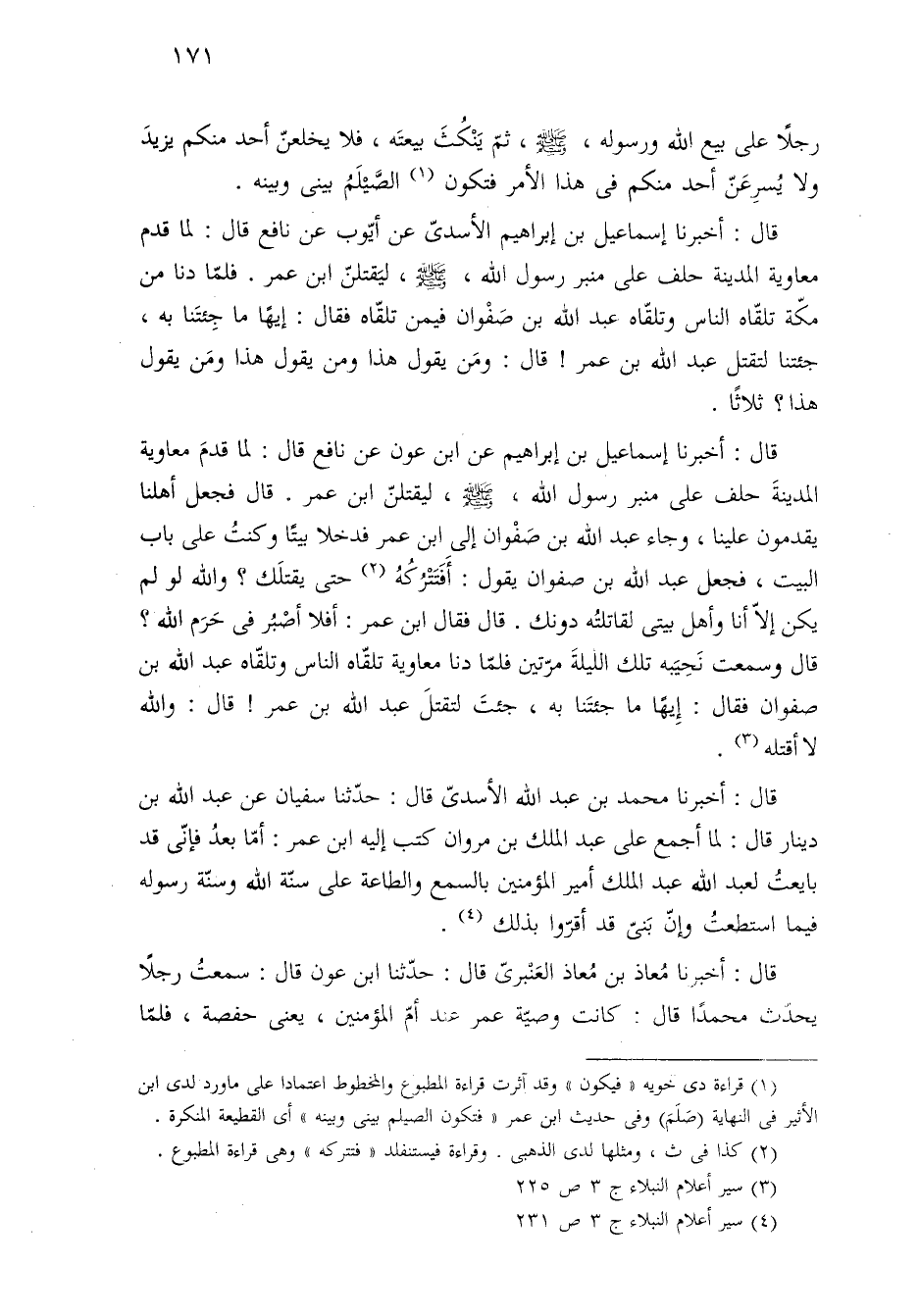 قال: أخبرنا إسماعيل بن إبراهيم الأسدىّ عن أيّوب عن نافع قال: لما قدم معاوية المدينة حلف على منبر رسول الله، -صلى الله عليه وسلم-، ليَقتلنّ ابن عمر. فلمّا دنا من مكّة تلقّاه الناس وتلقّاه عبد الله بن صَفْوان فيمن تلقّاه فقال: إيهًا ما جِئتَنا به، جئتنا لتقتل عبد الله بن عمر! قال: ومَن يقول هذا ومن يقول هذا ومَن يقول هذا؟ ثلاثًا.