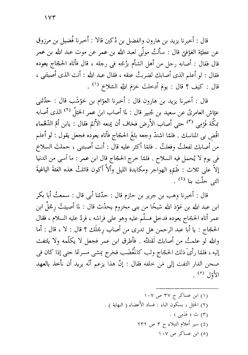 قال: أخبرنا يزيد بن هارون قال: أخبرنا العوّام بن حَوْشَب قال: حدّثنى عيّاش العامرىّ عن سعيد بن جُبير قال: لما أصاب ابنَ عمر الخبْلُ (¬٢) الذى أصابه بمكّة فَرُمِى (¬٣) حتى أصاب الأرض فخاف أن يمنعه الألمُ فقال: يا بن أمّ الدّهْماء اقْضِ بى المناسك. فلمّا اشتدّ وجعه بلغَ الحجّاج فأتاه يعوده فجعل يقول: لو أعلم من أصابك لفعلتُ وفعلتُ. فلمّا أكثر عليه قال: أنت أصبتنى، حملتَ السلاحَ في يوم لا يُحمل فيه السلاح. فلمّا خرج الحجّاج قال ابن عمر: ما آسى من الدنيا إلّا على ثلاث: ظَمْءِ الهواجر ومكابدة الليل وألّا أكون قاتلتُ هذه الفئةَ الباغيةَ التى حلّت بنا (¬٤).