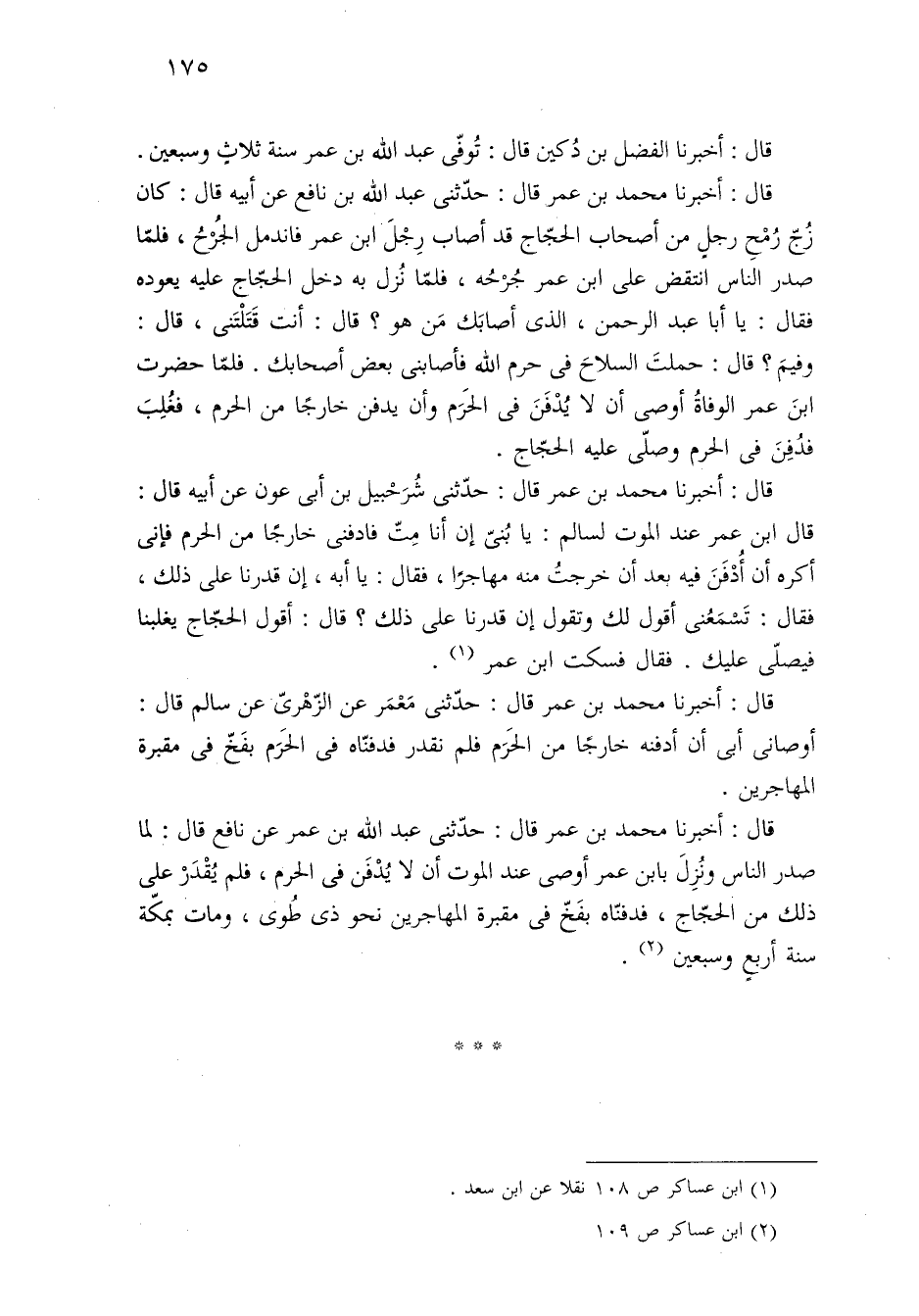قال: أخبرنا محمد بن عمر قال: حدّثنى مَعْمَر عن الزّهْرىّ عن سالم قال: أوصانى أبي أن أدفنه خارجًا من الحَرَم فلم نقدر فدفنّاه في الحَرَم بفَخّ في مقبرة المهاجرين.