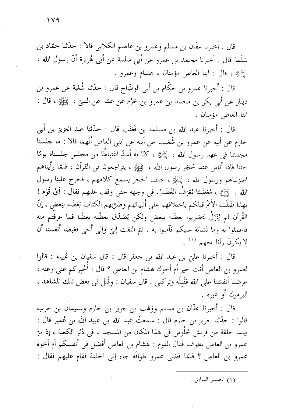 قال: أخبرنا عفّان بن مسلم وعمرو بن عاصم الكلابى قالا: حدّثنا حمّاد بن سَلَمة قال: أخبرنا محمد بن عمرو عن أبي سلمة عن أبي هُريرة أنّ رسول الله، -صلى الله عليه وسلم-، قال: ابنا العاص مؤمنان، هشام وعمرو.