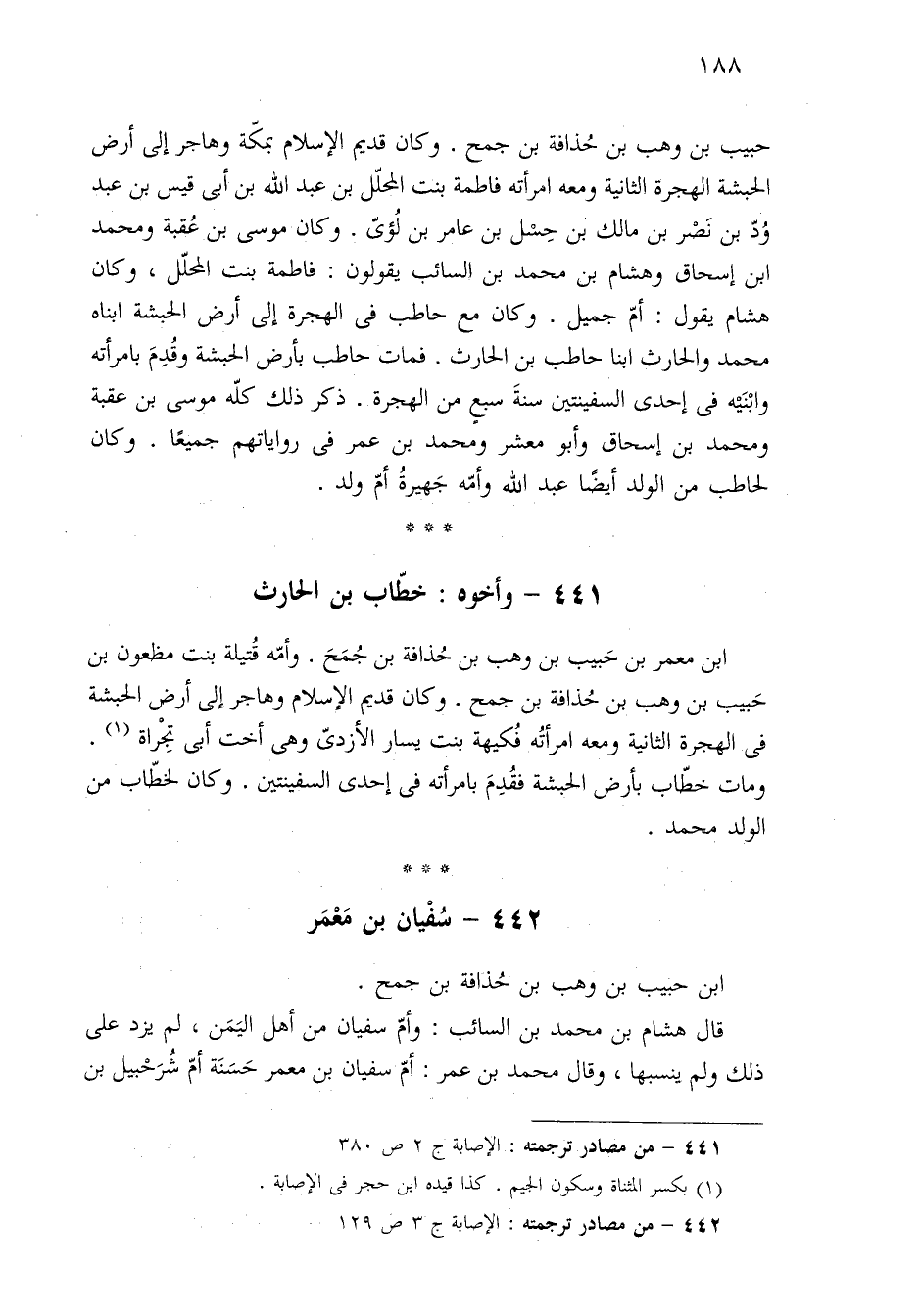 حبيب بن وهب بن حُذافة بن جمح. وكان قديم الإسلام بمكّة وهاجر إلى أرض الحبشة الهجرة الثانية ومعه امرأته فاطمة بنت المحلّل بن عبد الله بن أبي قيس بن عبد وُدّ بن نَصْر بن مالك بن حِسْل بن عامر بن لُؤىّ. وكان موسى بن عُقبة ومحمد ابن إسحاق وهشام بن محمد بن السائب يقولون: فاطمة بنت المحلّل، وكان هشام يقول: أمّ جميل. وكان مع حاطب في الهجرة إلى أرض الحبشة ابناه محمد والحارث ابنا حاطب بن الحارث. فمات حاطب بأرض الحبشة وقُدِمَ بامرأته وابْنَيْه في إحدى السفينتين سنةَ سبعٍ من الهجرة. ذكر ذلك كلّه موسى بن عقبة ومحمد بن إسحاق وأبو معشر ومحمد بن عمر في رواياتهم جميعًا. وكان لحاطب من الولد أيضًا عبد الله وأمّه جَهيرةُ أمّ ولد.