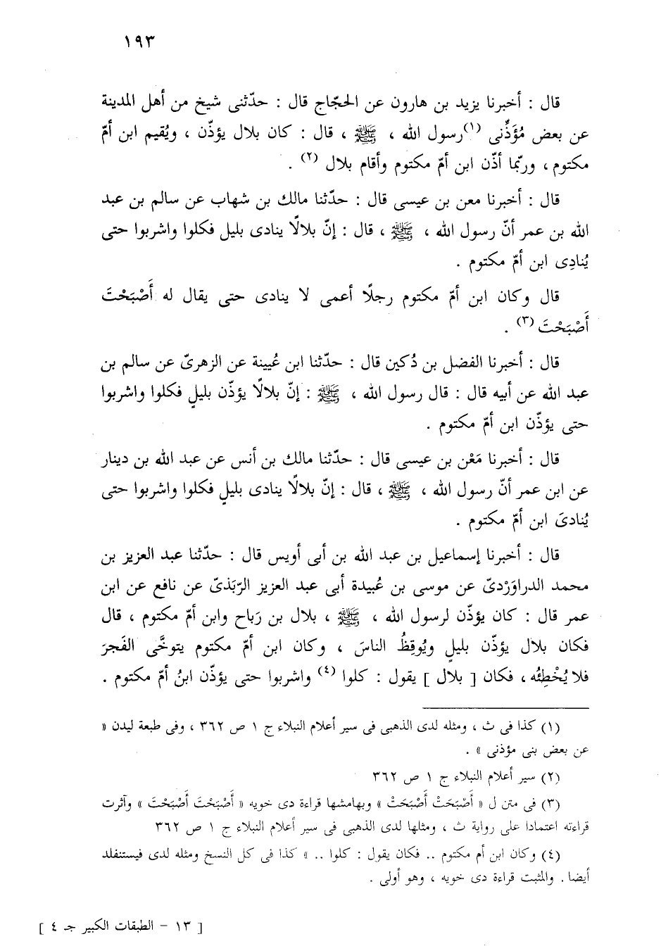 قال: أخبرنا مَعْن بن عيسى قال: حدّثنا مالك بن أنس عن عبد الله بن دينار عن ابن عمر أنّ رسول الله، -صلى الله عليه وسلم-، قال: إنّ بلالًا ينادى بليلٍ فكلوا واشربوا حتى يُنادىَ ابن أمّ مكتوم.