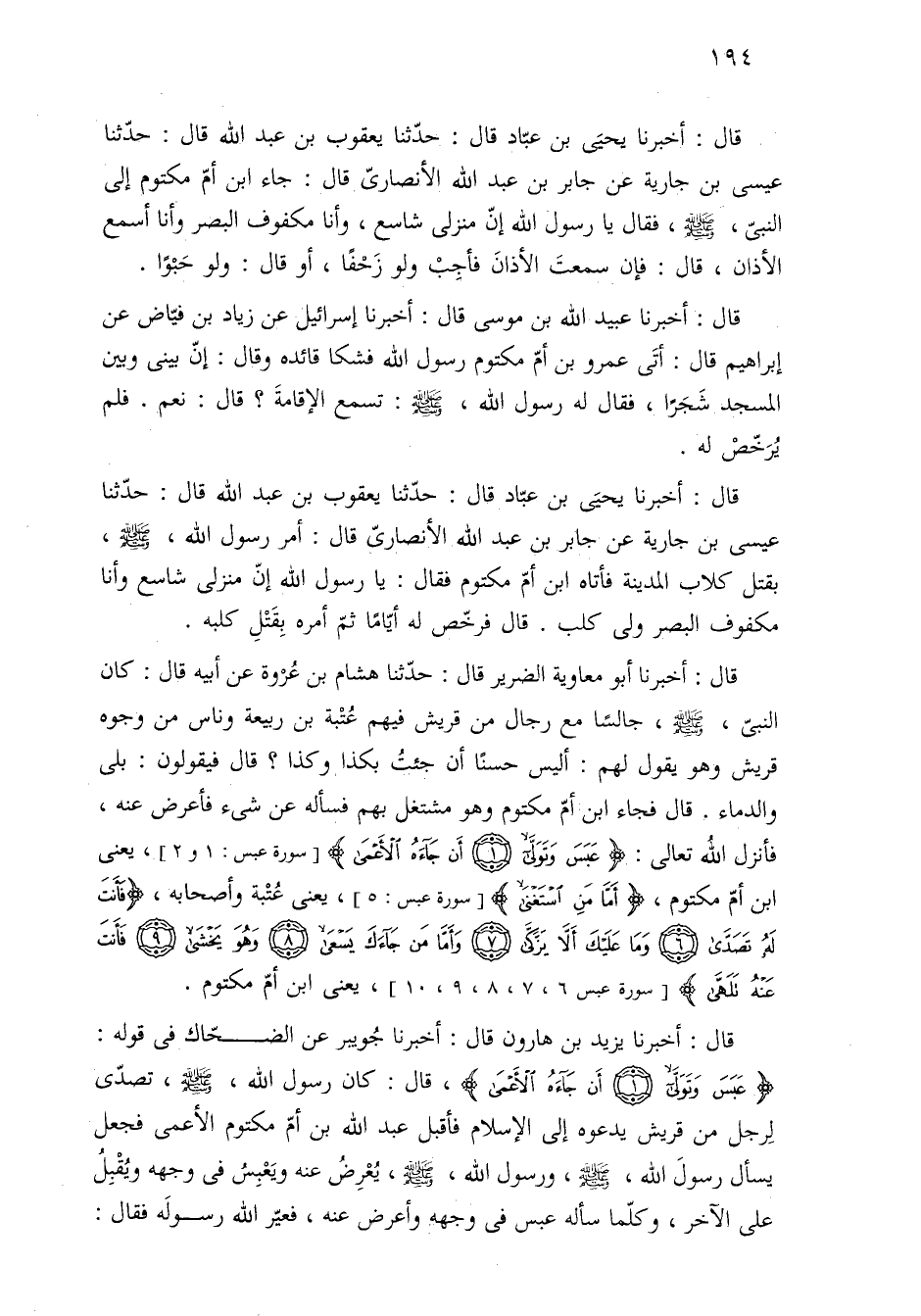 قال: أخبرنا أبو معاوية الضرير قال: حدّثنا هشام بن عُرْوة عن أبيه قال: كان النبيّ، -صلى الله عليه وسلم-، جالسًا مع رجال من قريش فيهم عُتْبة بن ربيعة وناس من وجوه قريش وهو يقول لهم: أليس حسنًا أن جئتُ بكذا وكذا؟ قال فيقولون: بلى والدماء. قال فجاء ابن أمّ مكتوم وهو مشتغل بهم فسأله عن شئ فأعرض عنه، فأنزل اللهُ تعالى: {عَبَسَ وَتَوَلَّى (١) أَنْ جَاءَهُ الْأَعْمَى} [سورة عبس: ١ و ٢]، يعنى ابن أمّ مكتوم، {أَمَّا مَنِ اسْتَغْنَى} [سورة عبس: ٥]، يعنى عُتْبة وأصحابه، {فَأَنْتَ لَهُ تَصَدَّى (٦) وَمَا عَلَيْكَ أَلَّا يَزَّكَّى (٧) وَأَمَّا مَنْ جَاءَكَ يَسْعَى (٨) وَهُوَ يَخْشَى (٩) فَأَنْتَ عَنْهُ تَلَهَّى} [سورة عبس: ٦، ٧، ٨، ٩، ١٠]، يعنى ابن أمّ مكتوم.